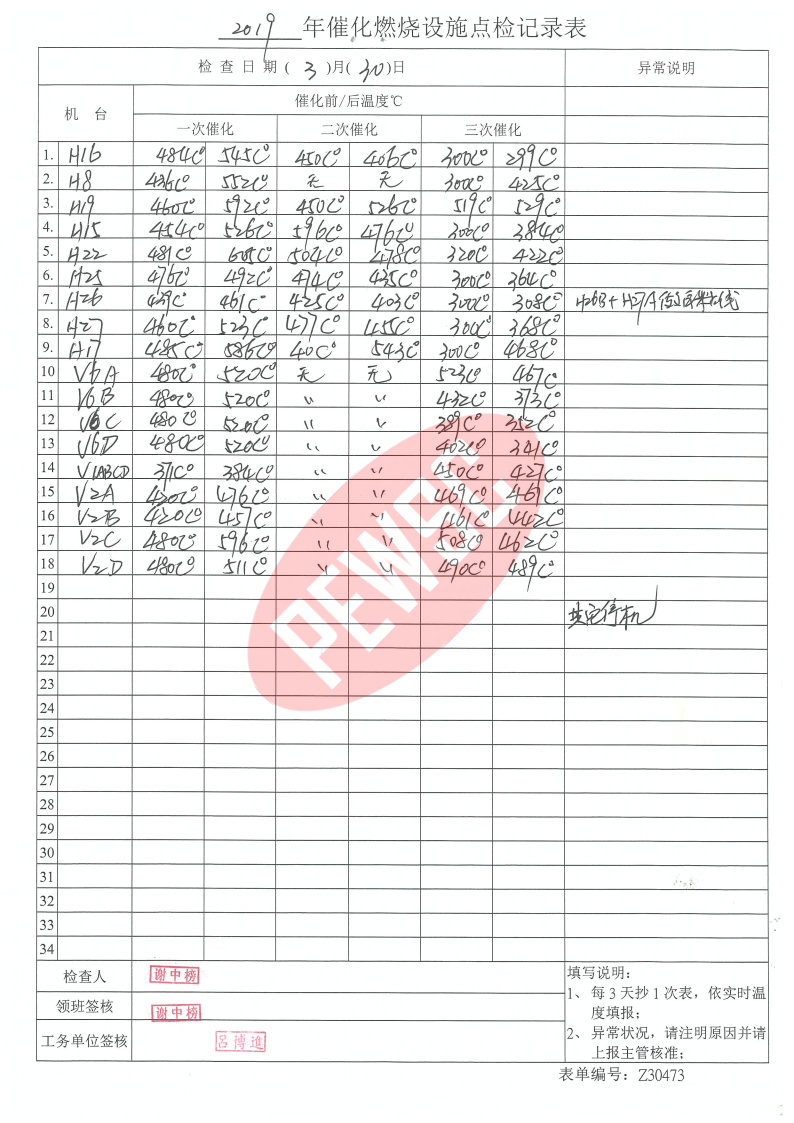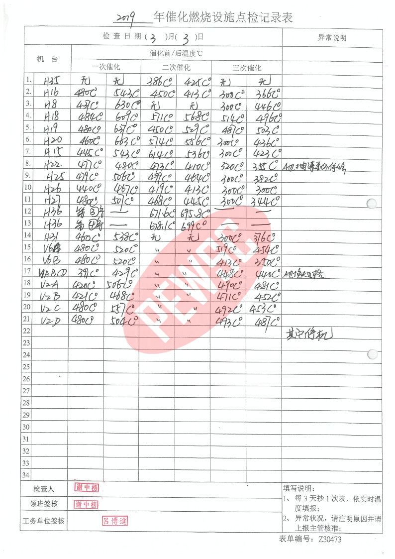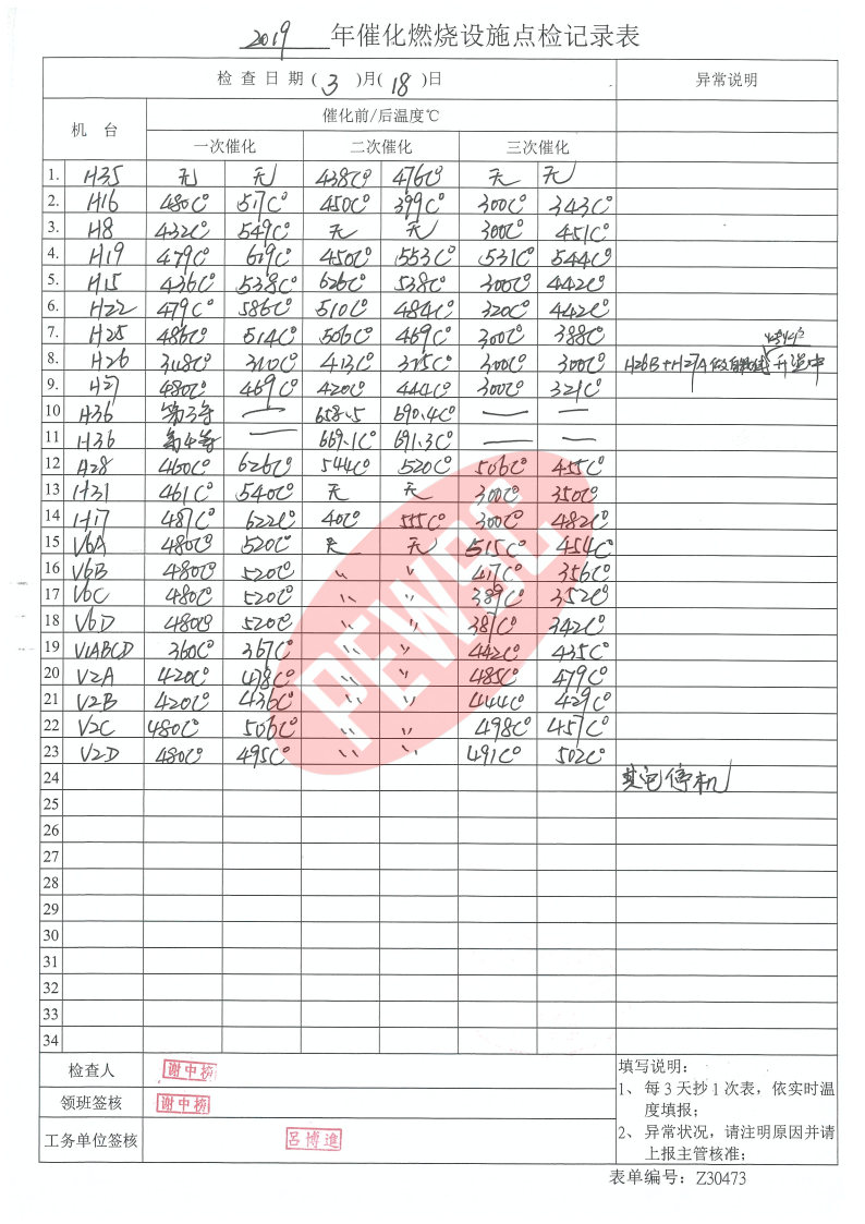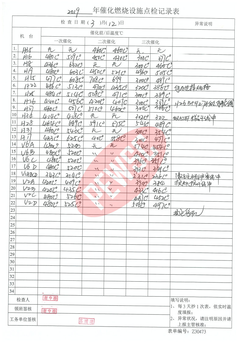 2019年3月份催化燃烧运行台账