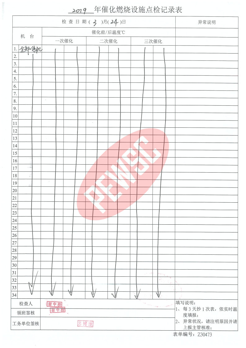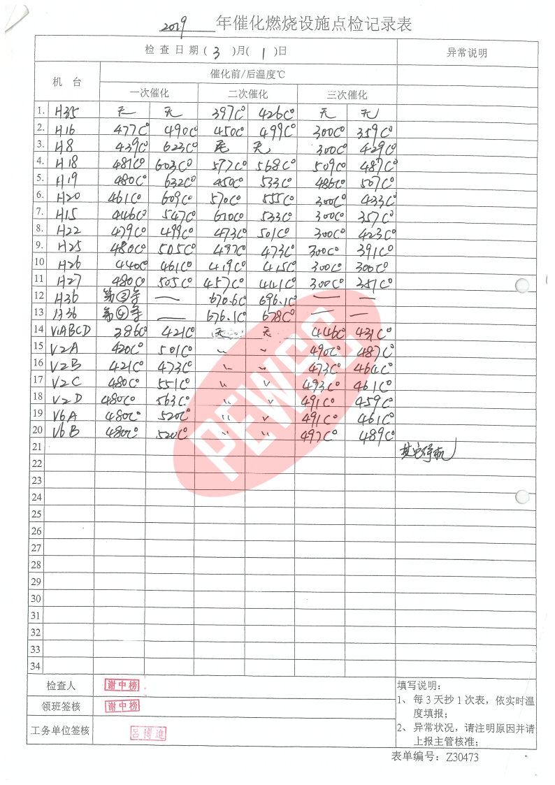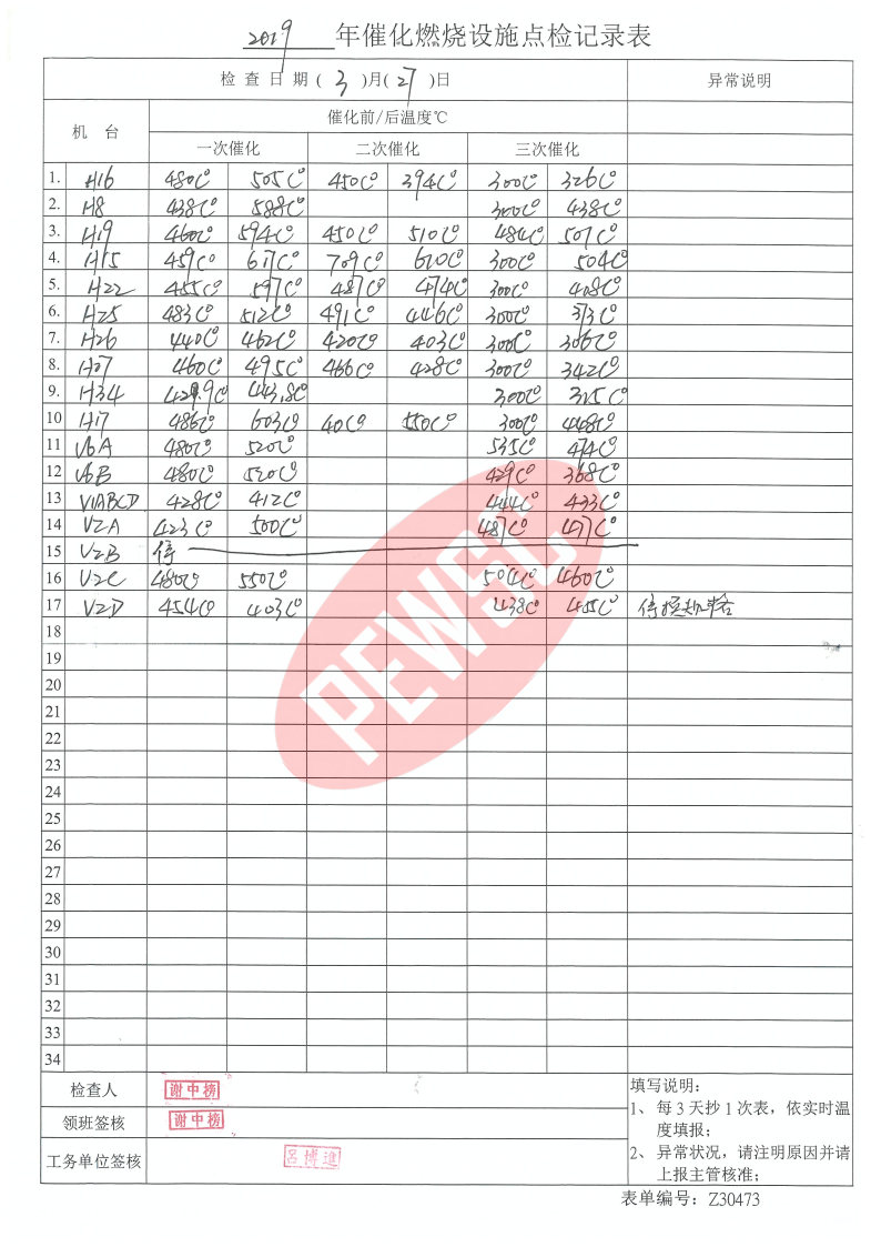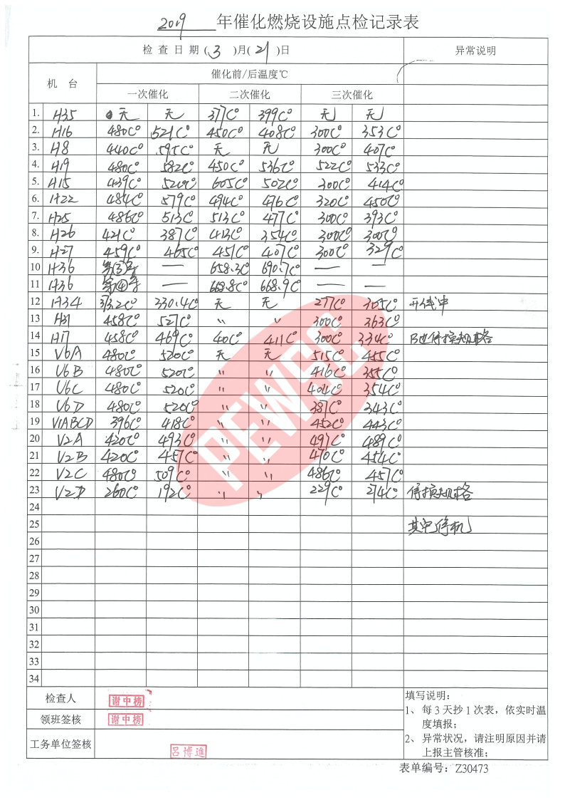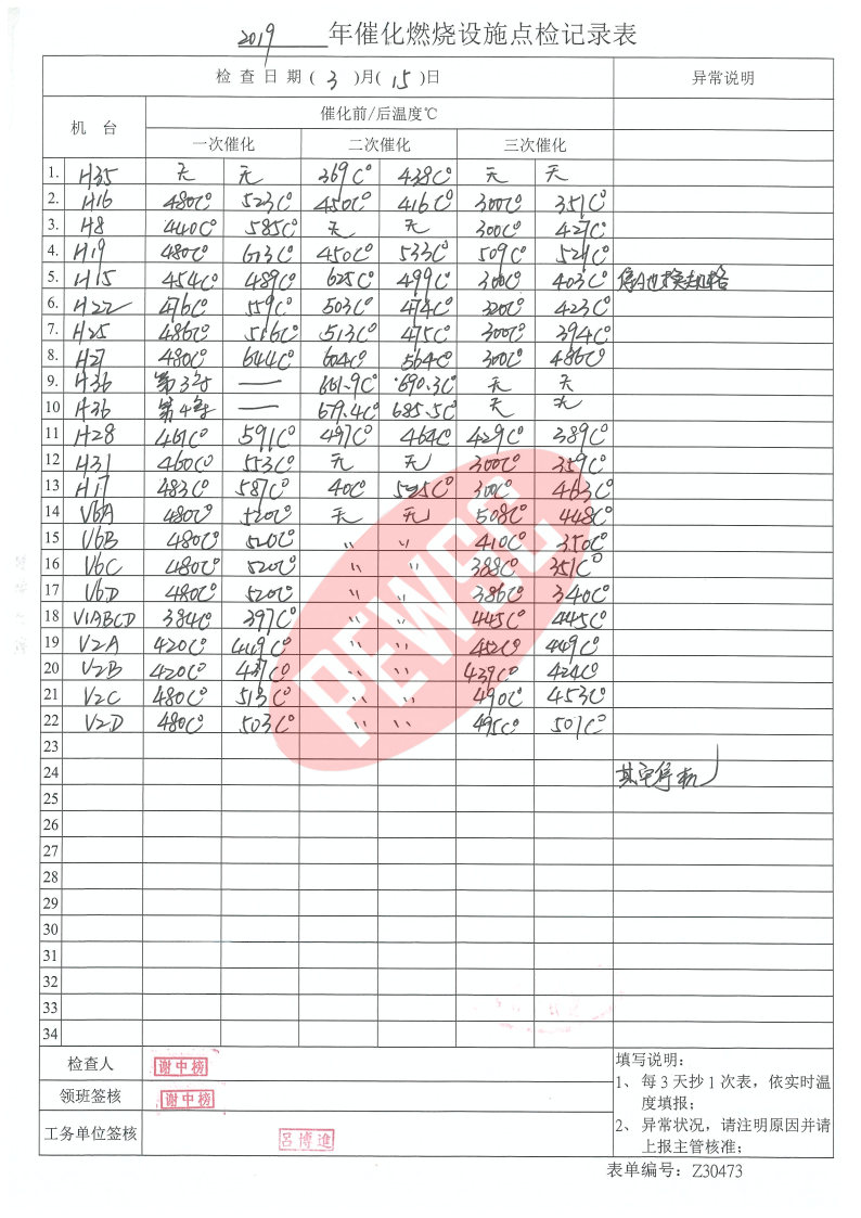 2019年3月份催化燃烧运行台账