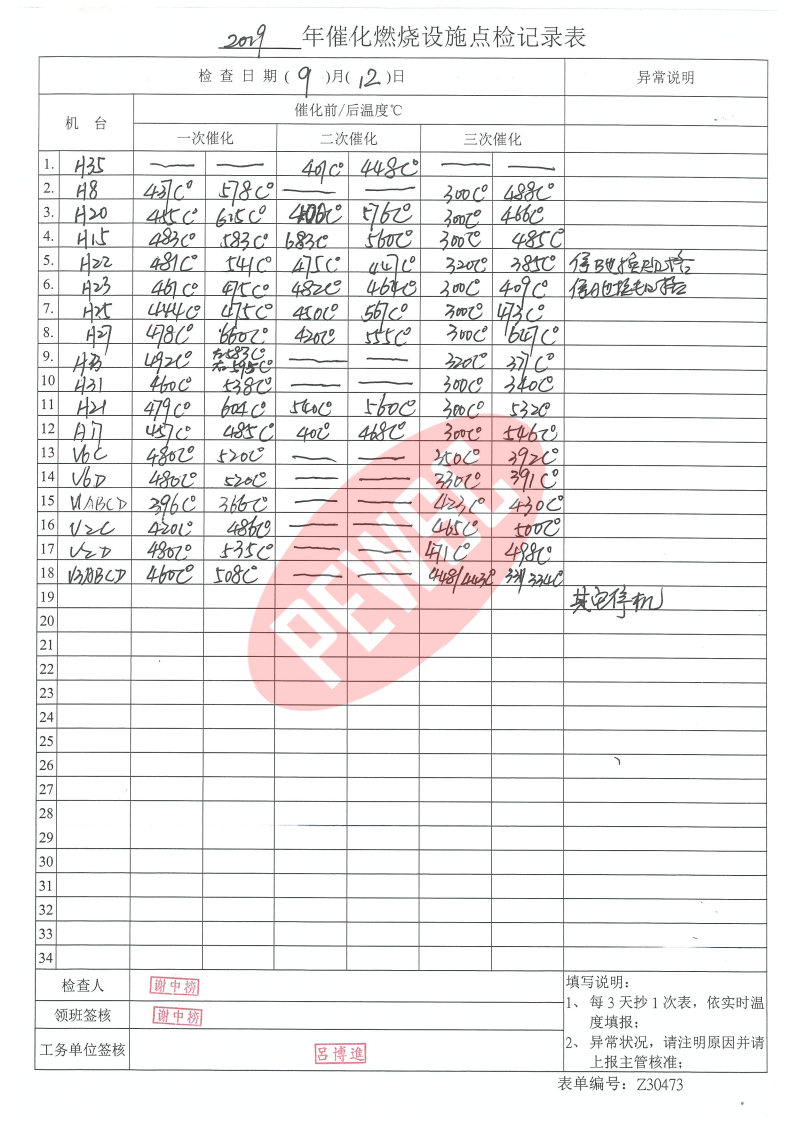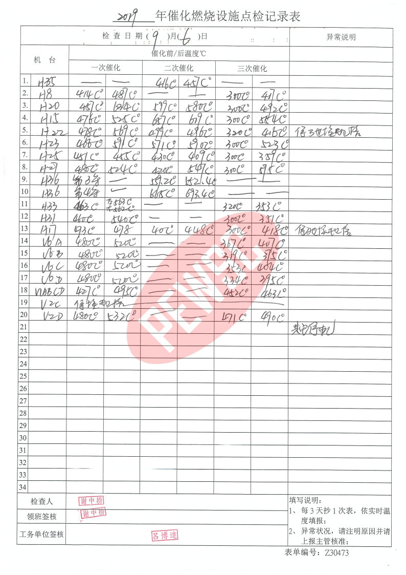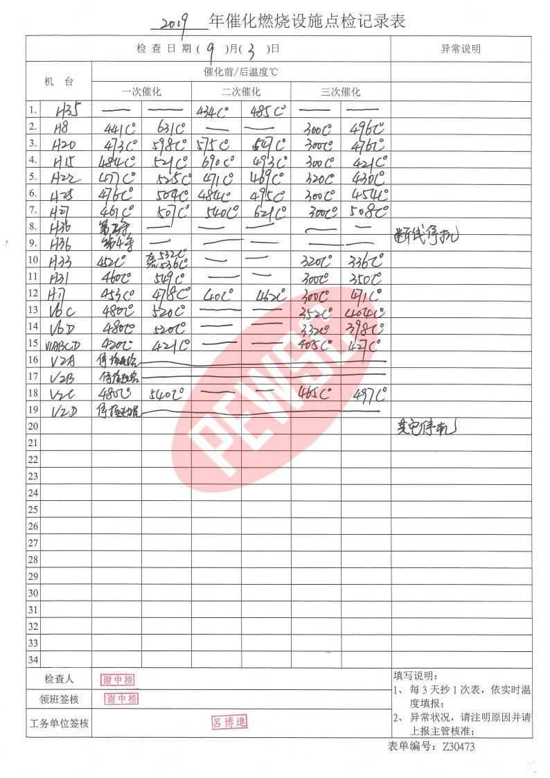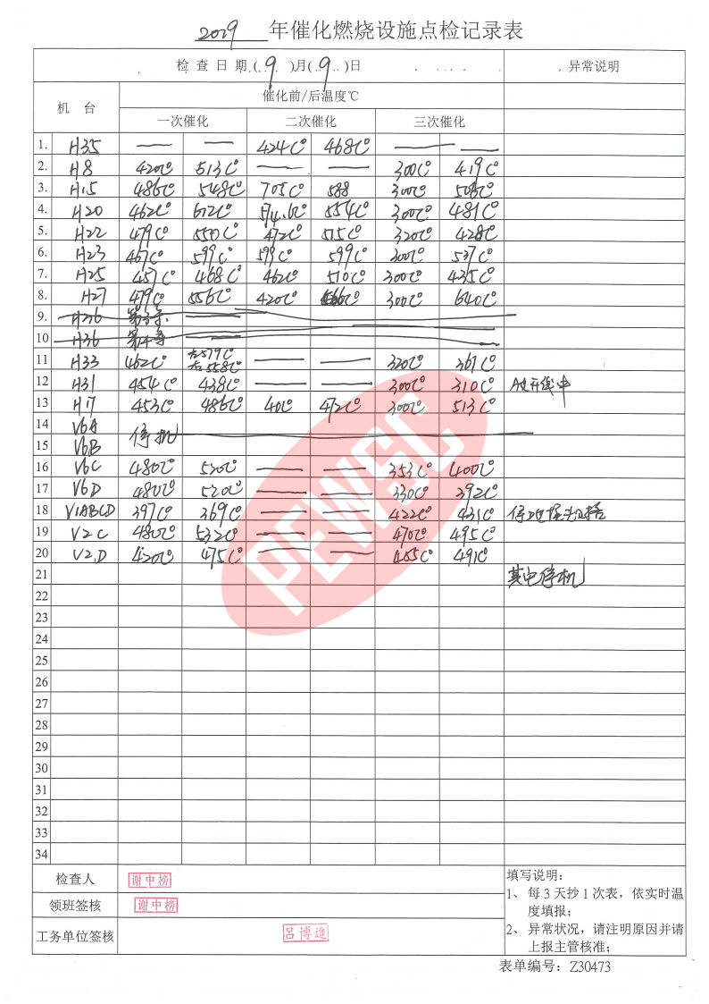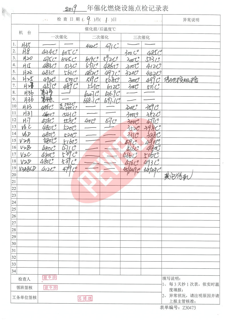 2019年9月份催化燃烧运行台账