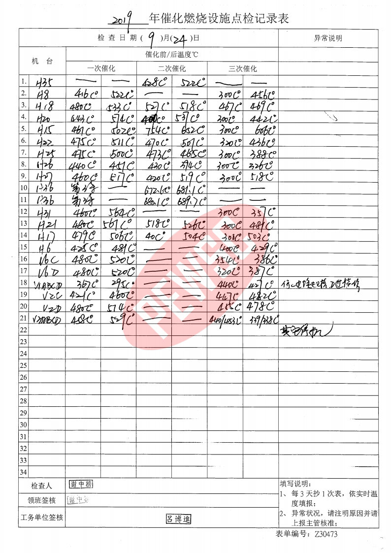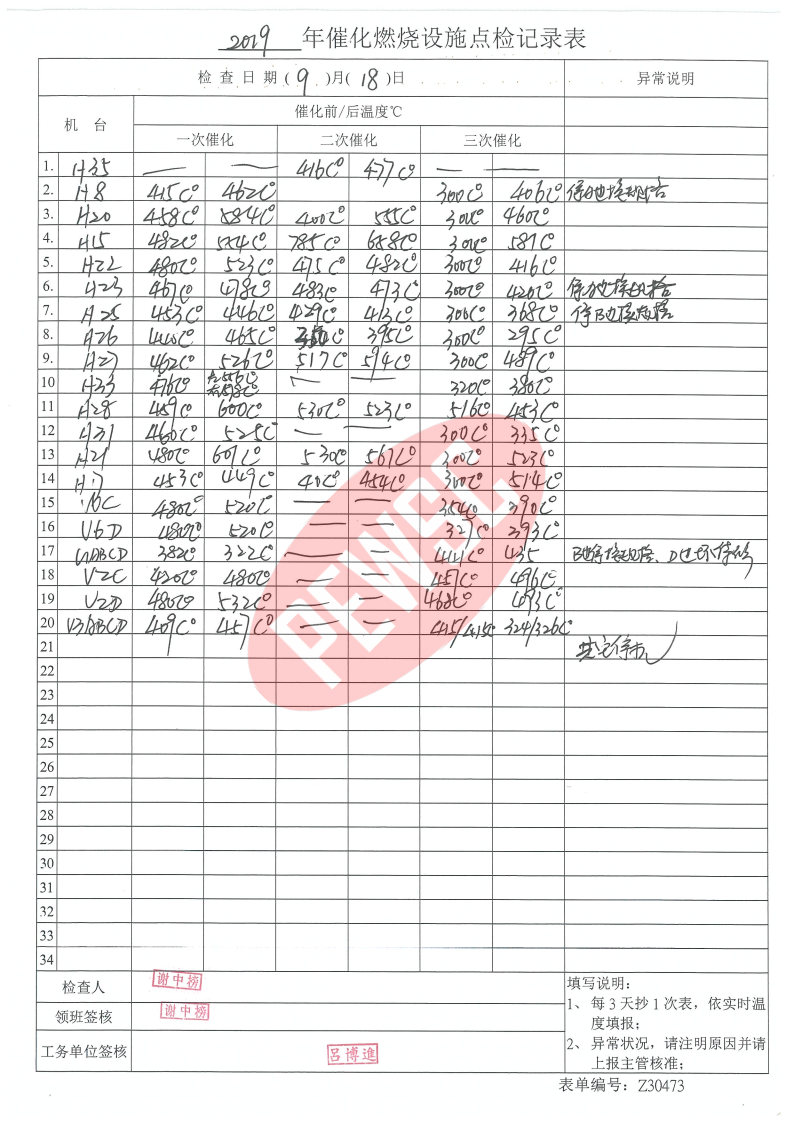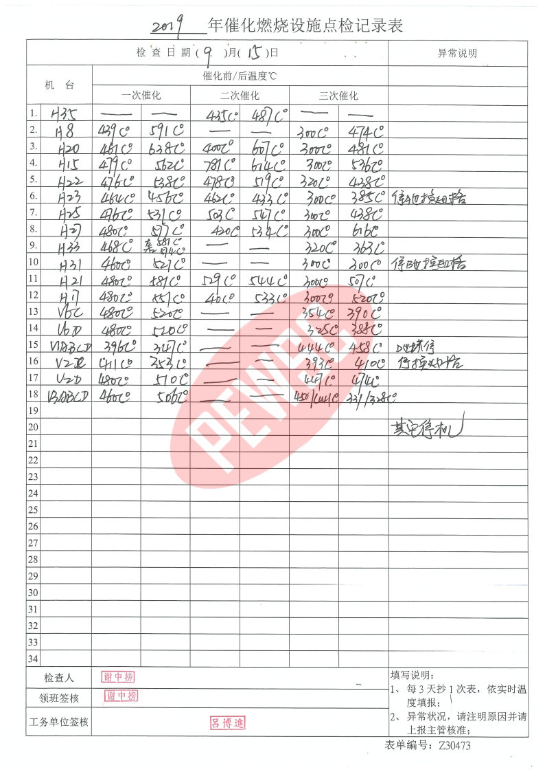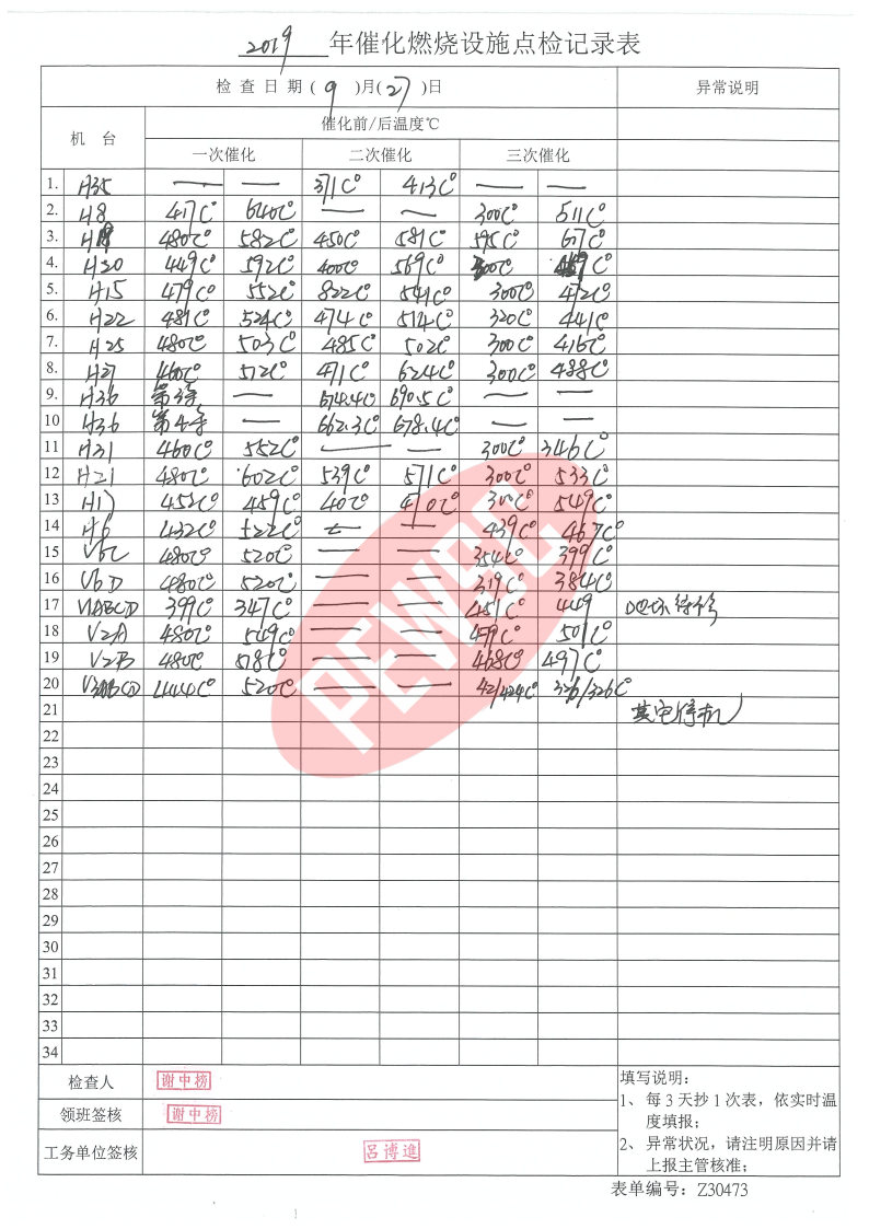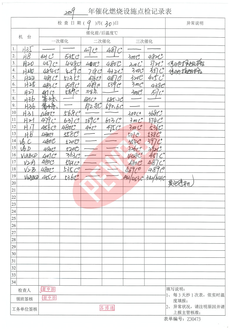 2019年9月份催化燃烧运行台账