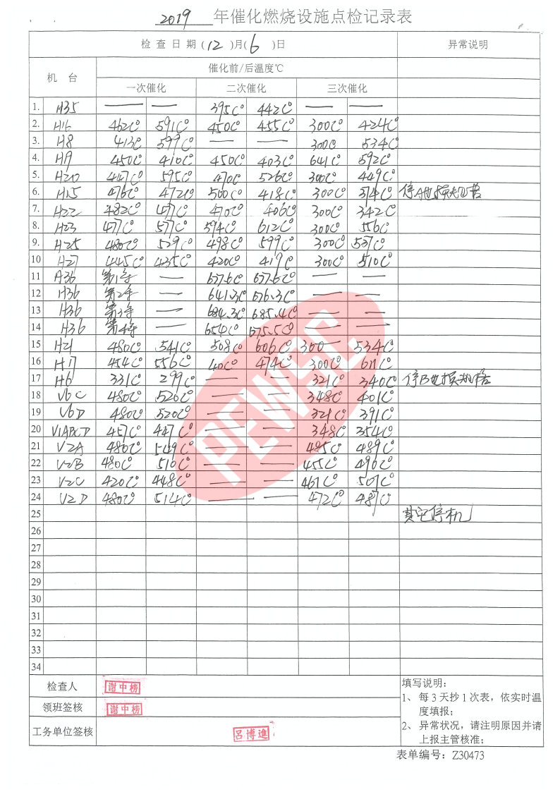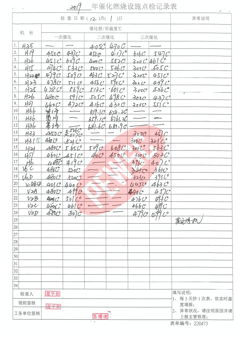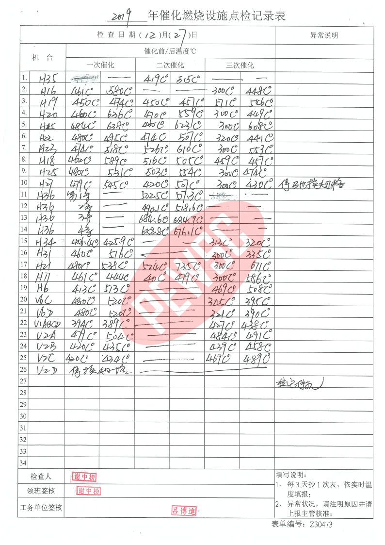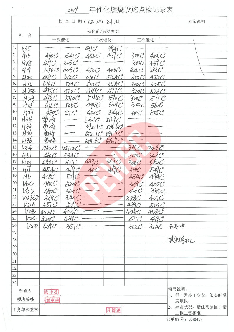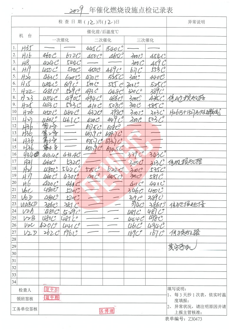 2019年12月份催化燃烧运行台账