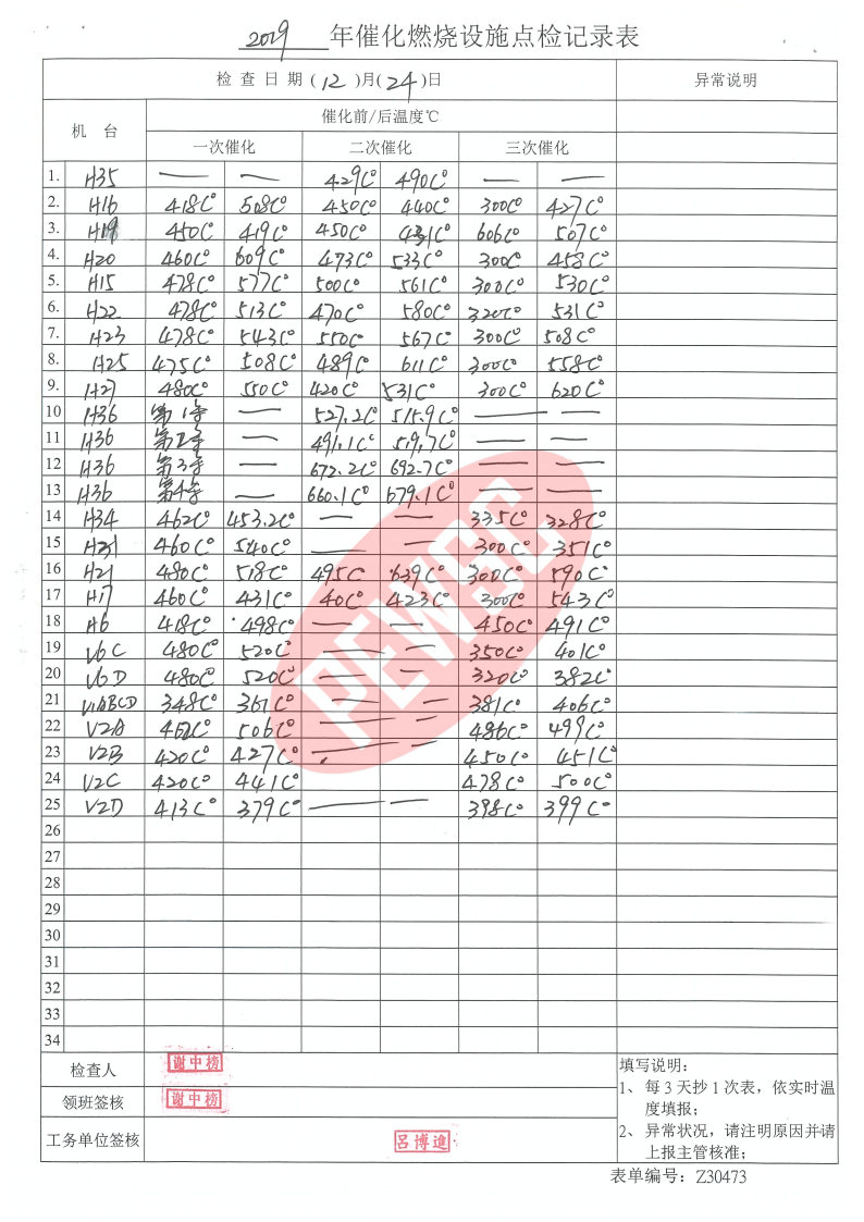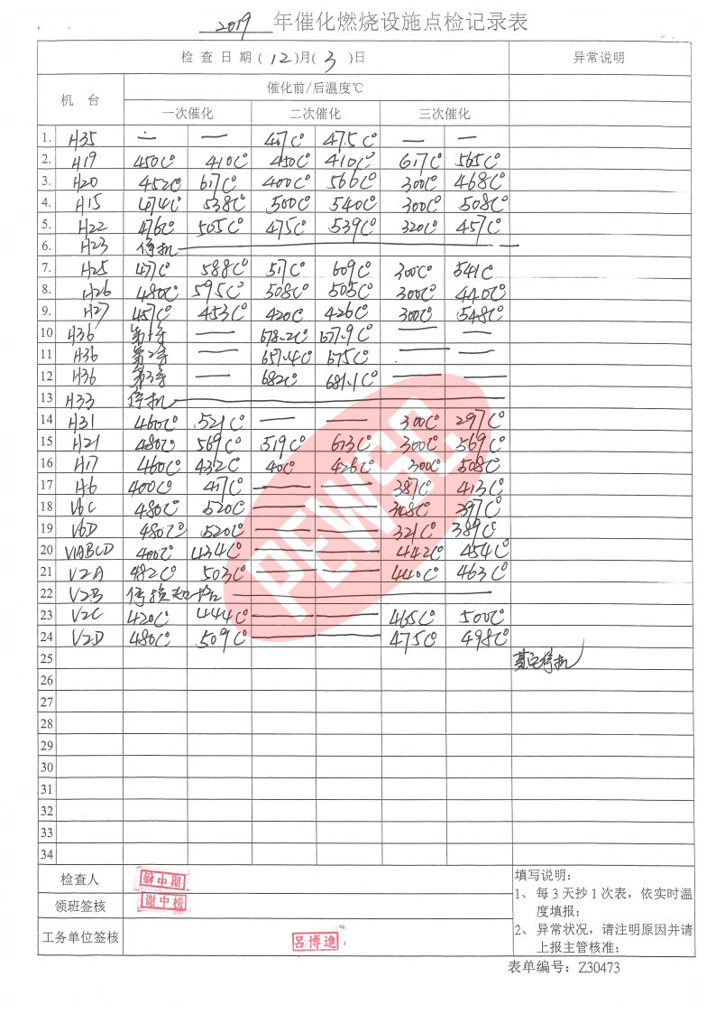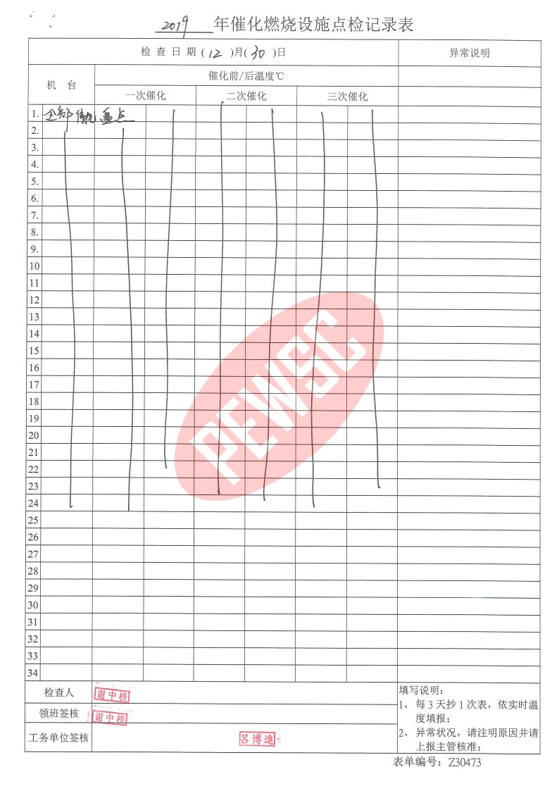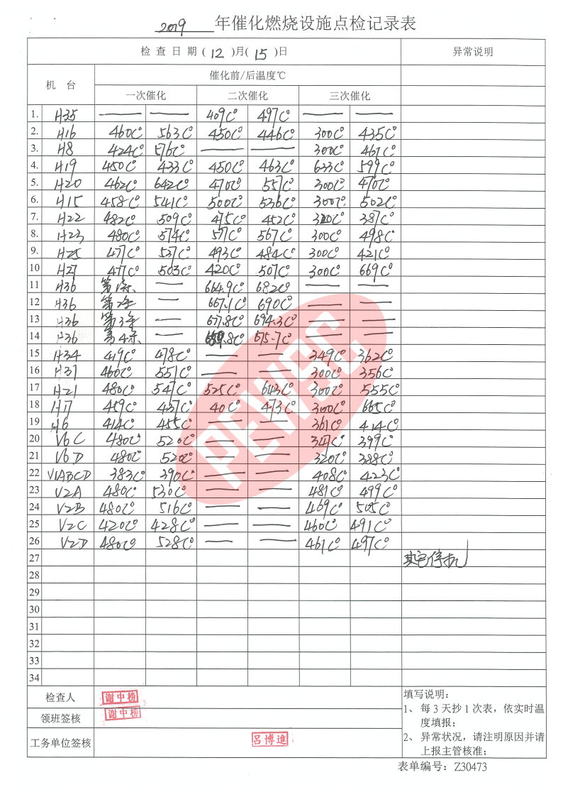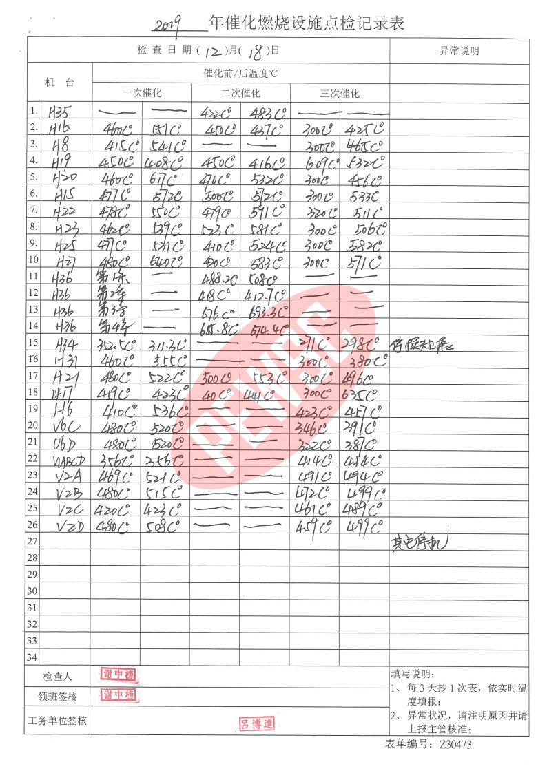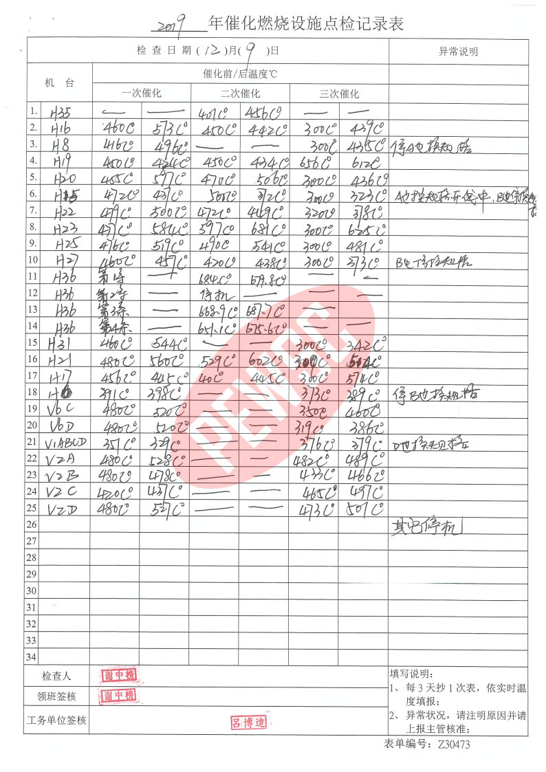 2019年12月份催化燃烧运行台账