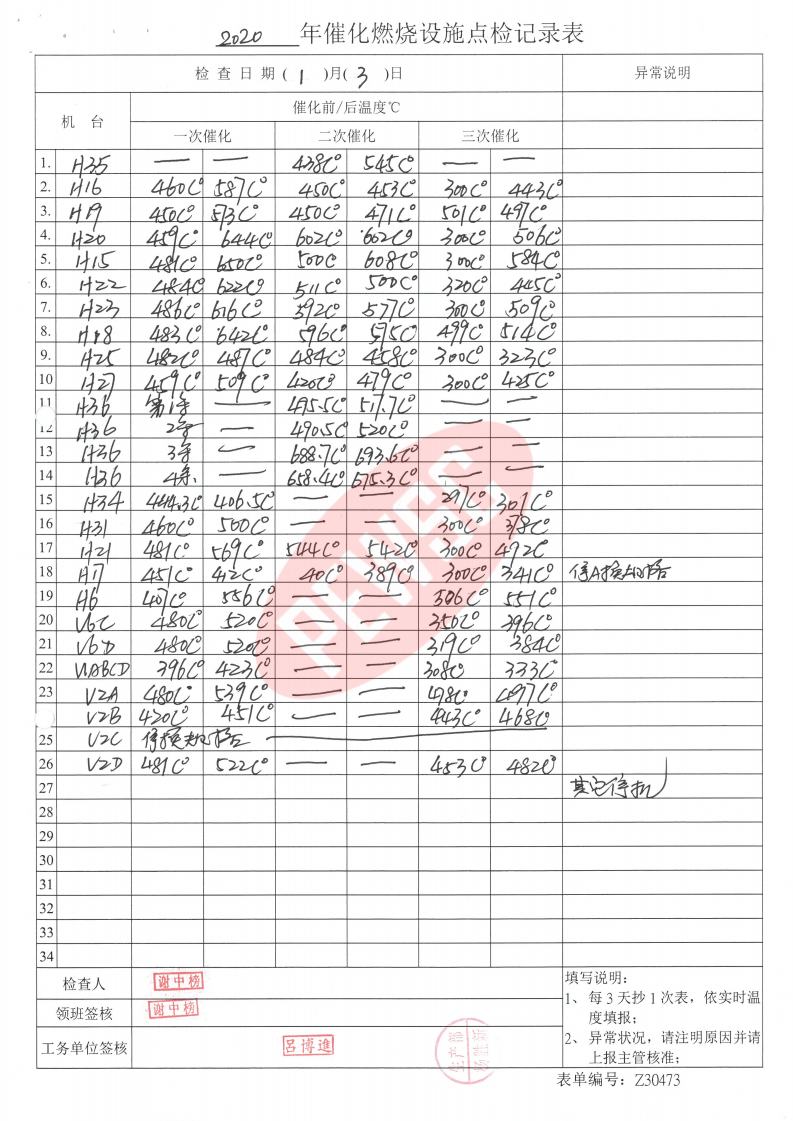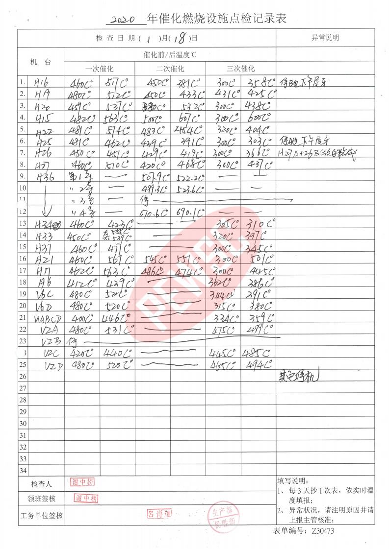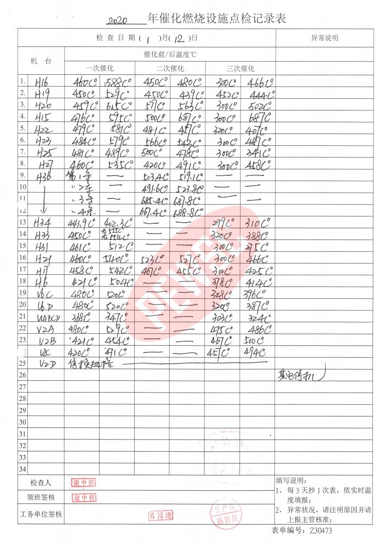 2020年1月份催化燃烧运行台账