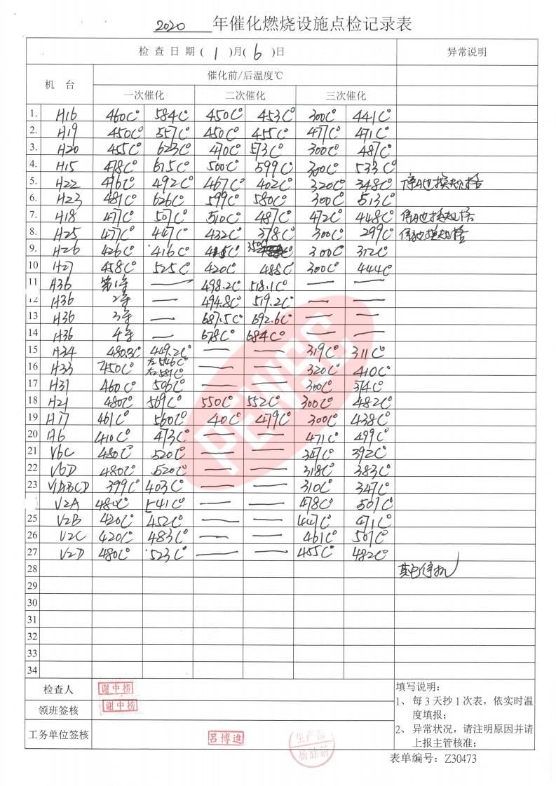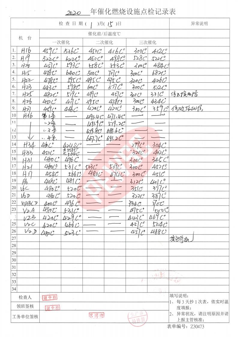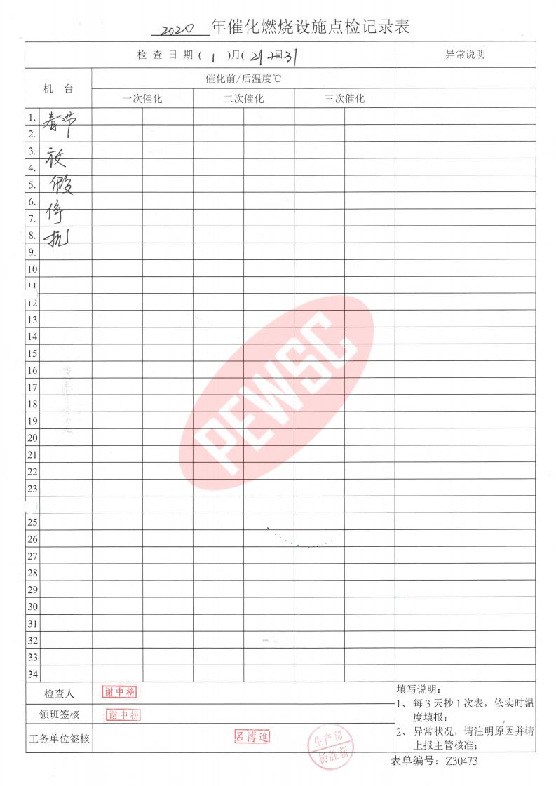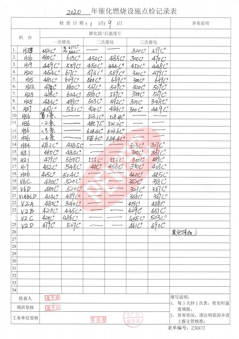 2020年1月份催化燃烧运行台账