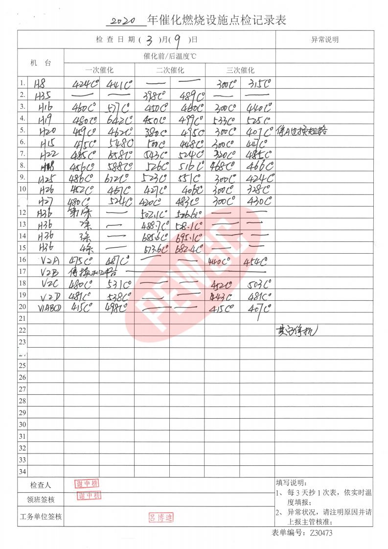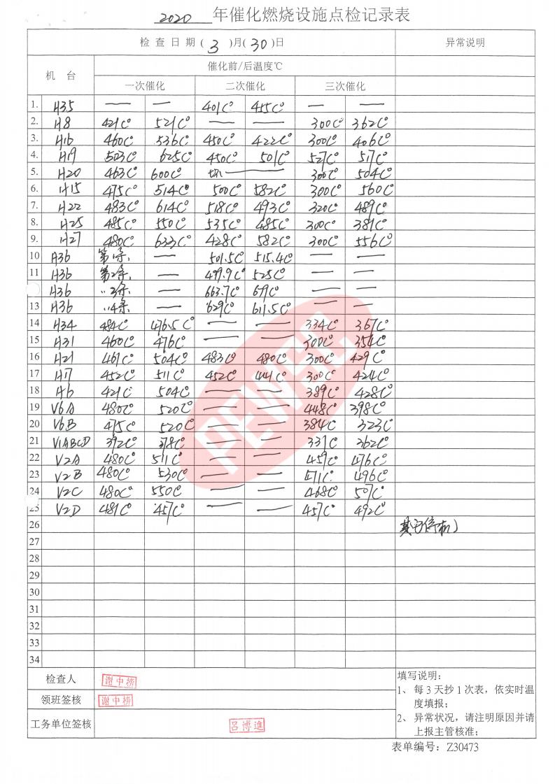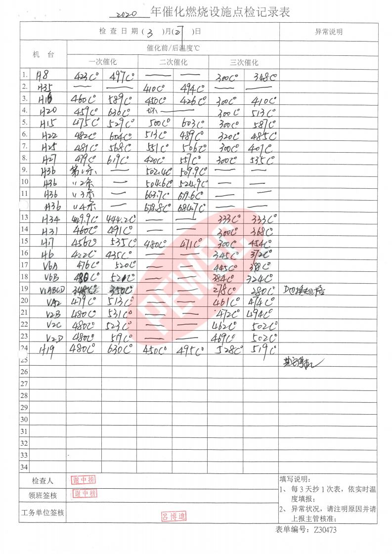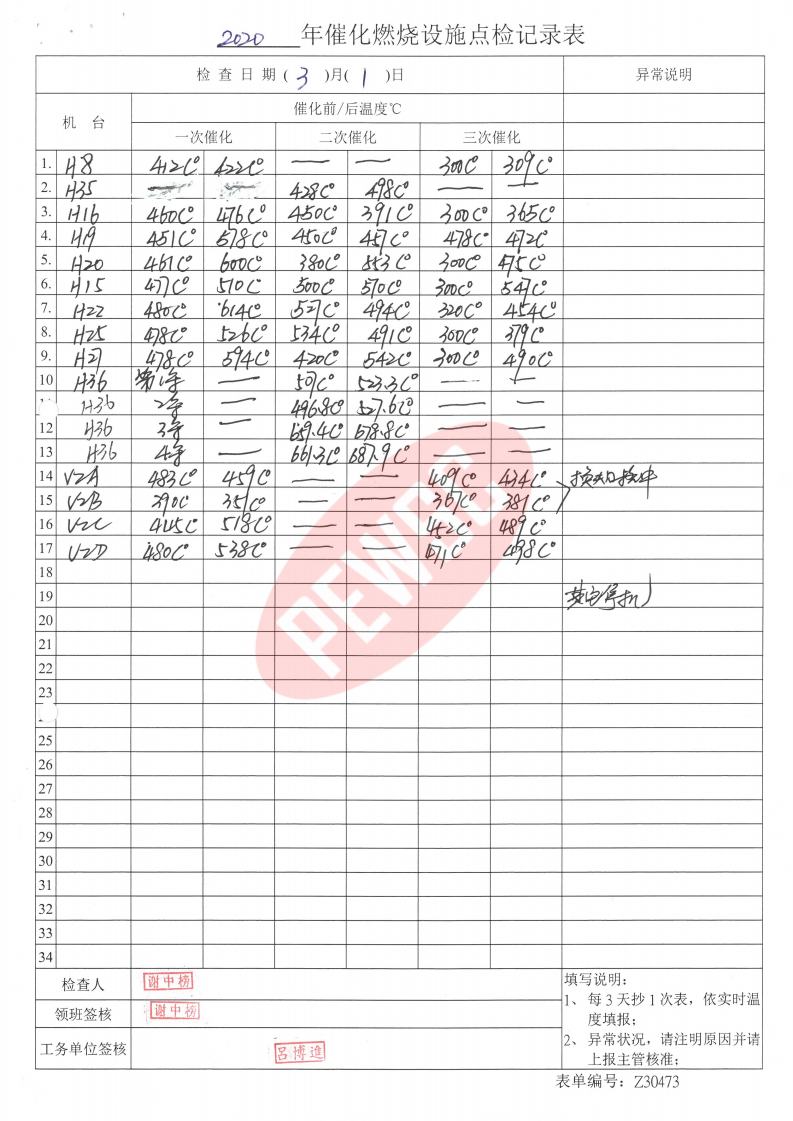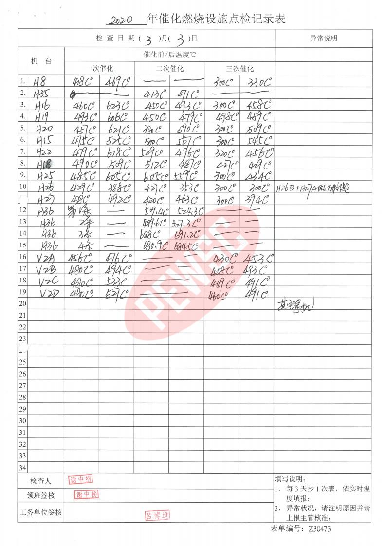 2020年3月份催化燃烧运行台账