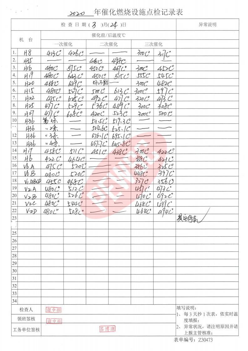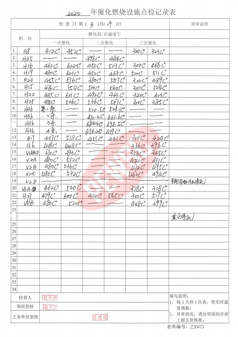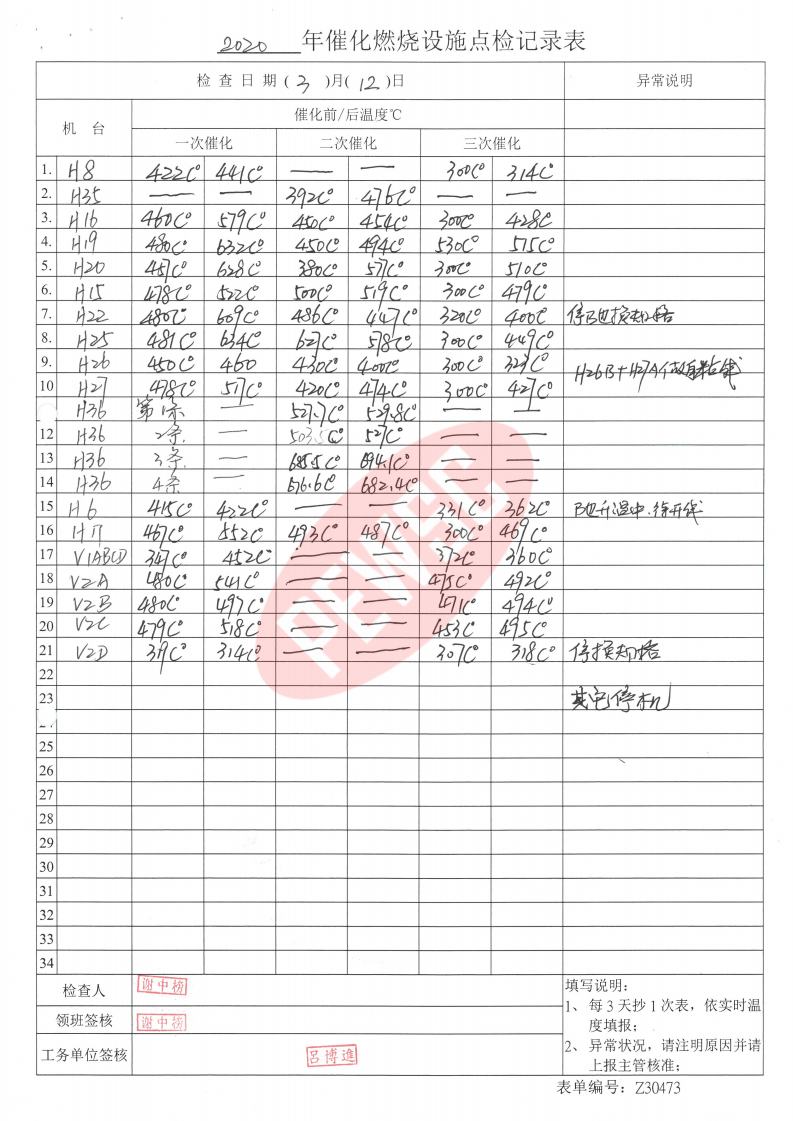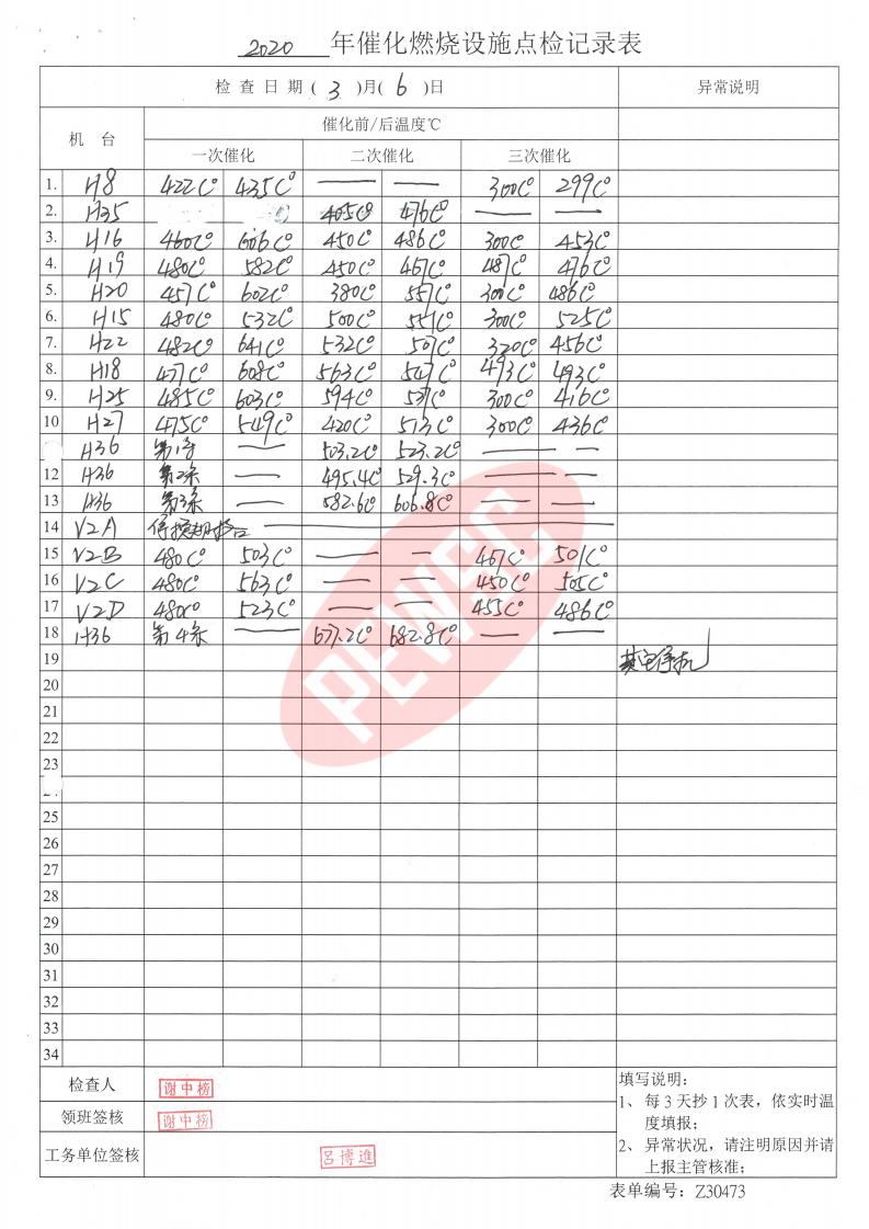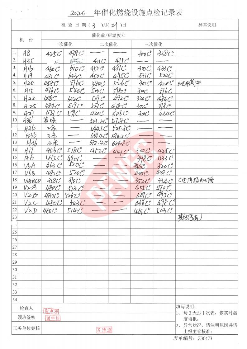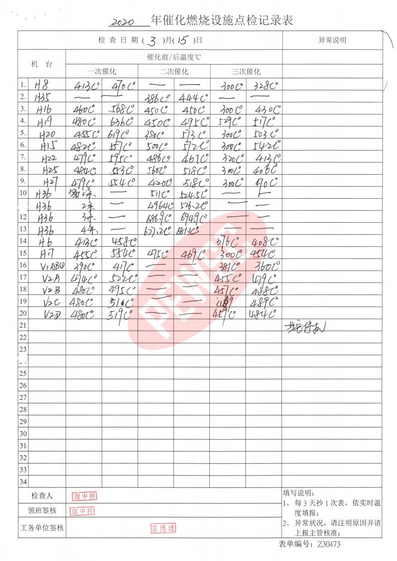 2020年3月份催化燃烧运行台账