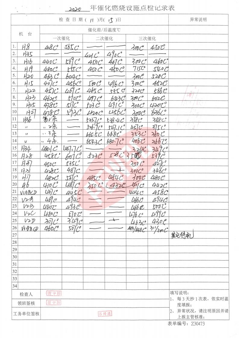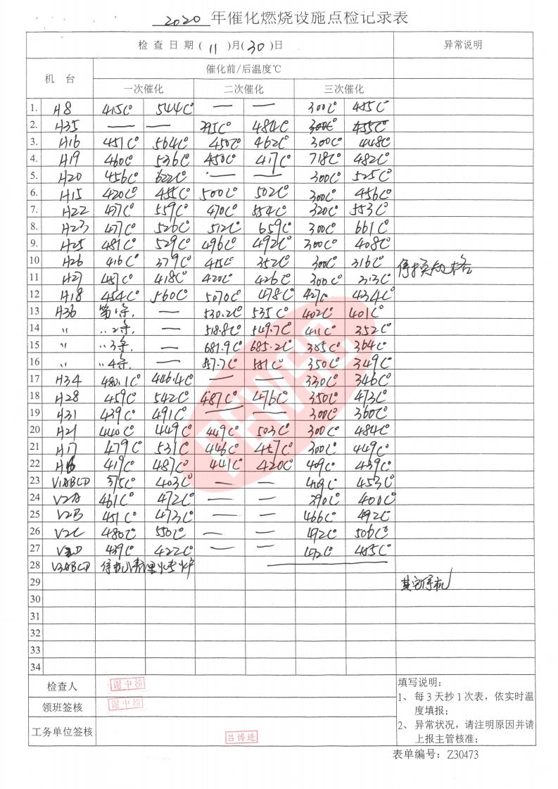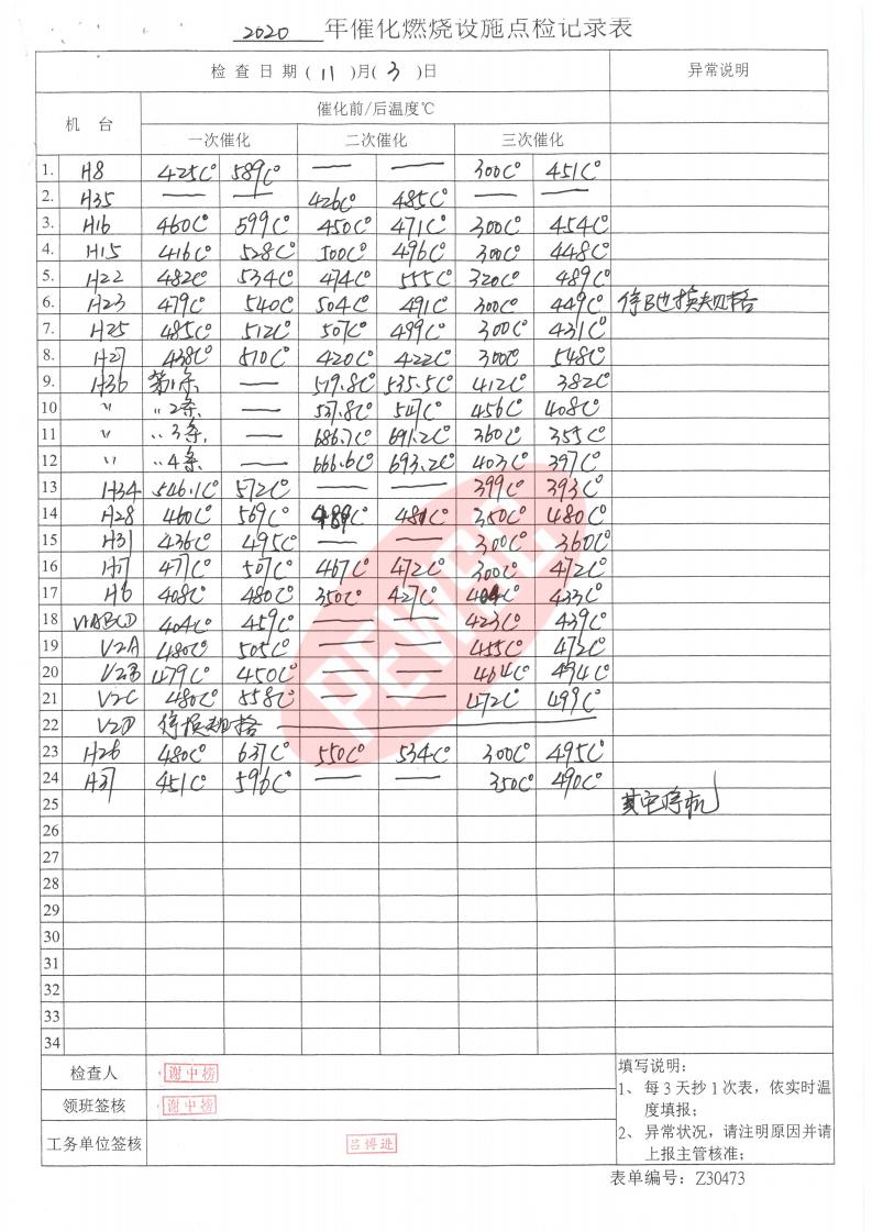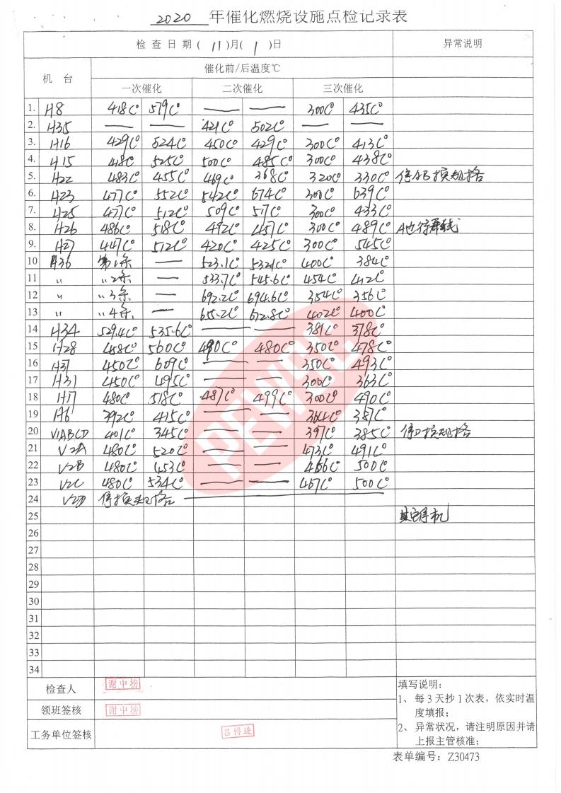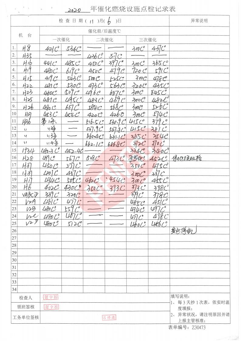 2020年11月份催化燃烧运行台账