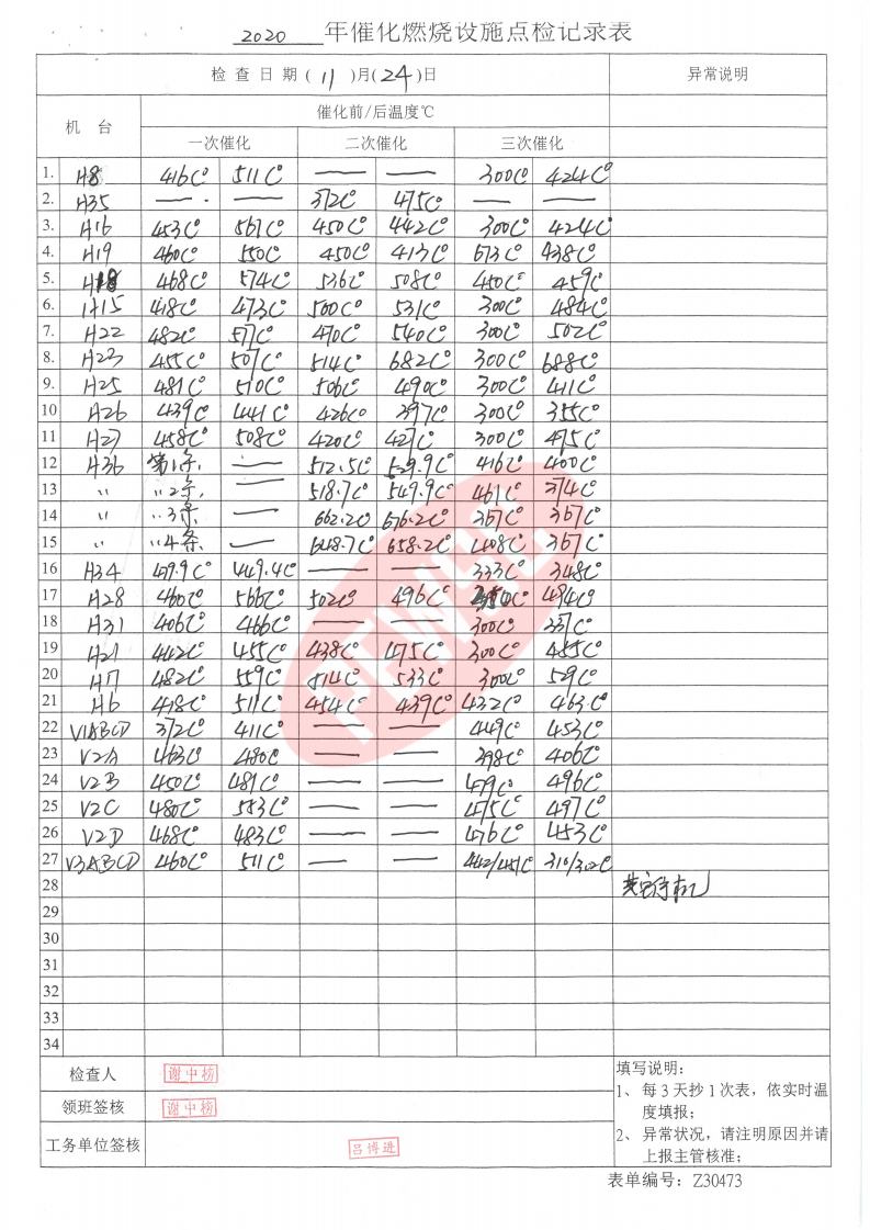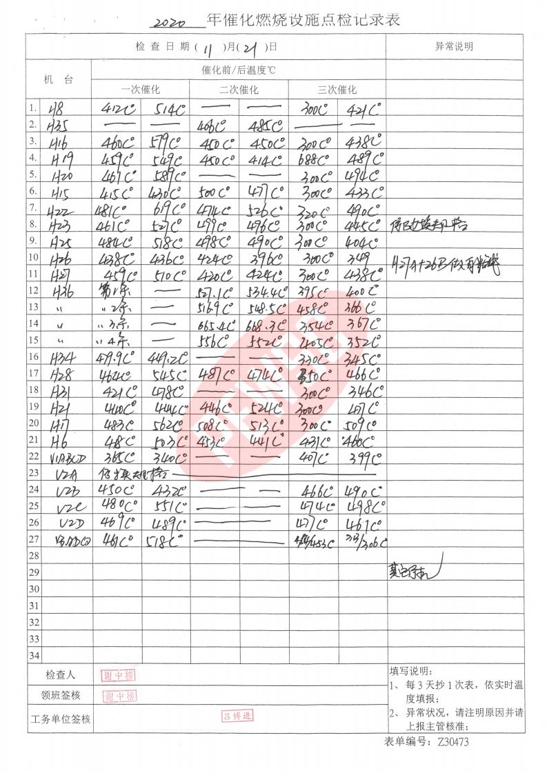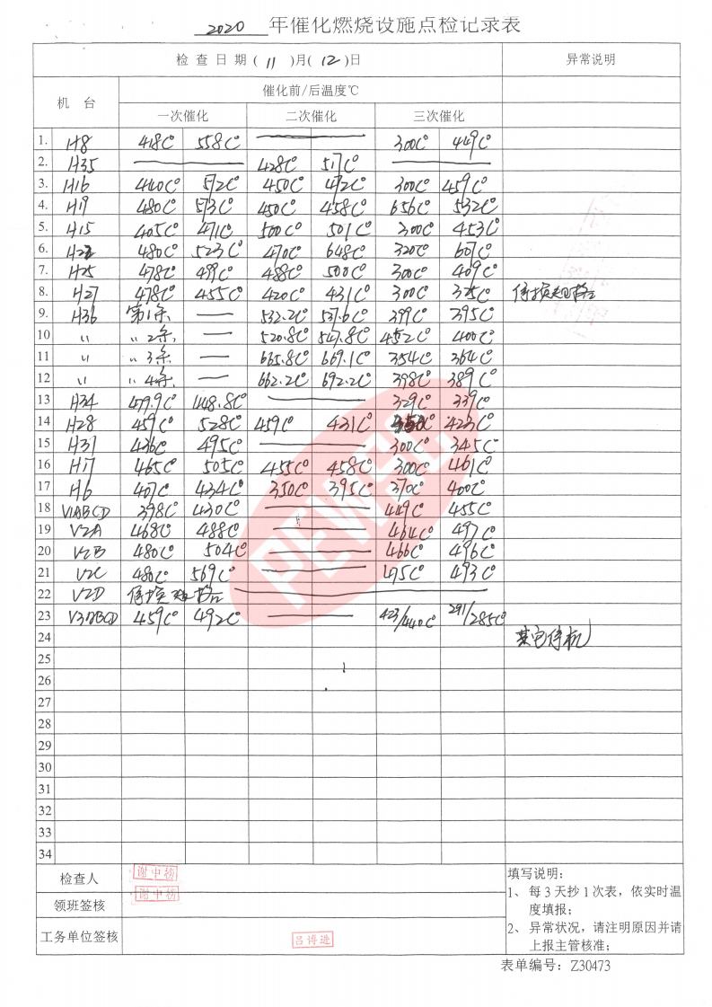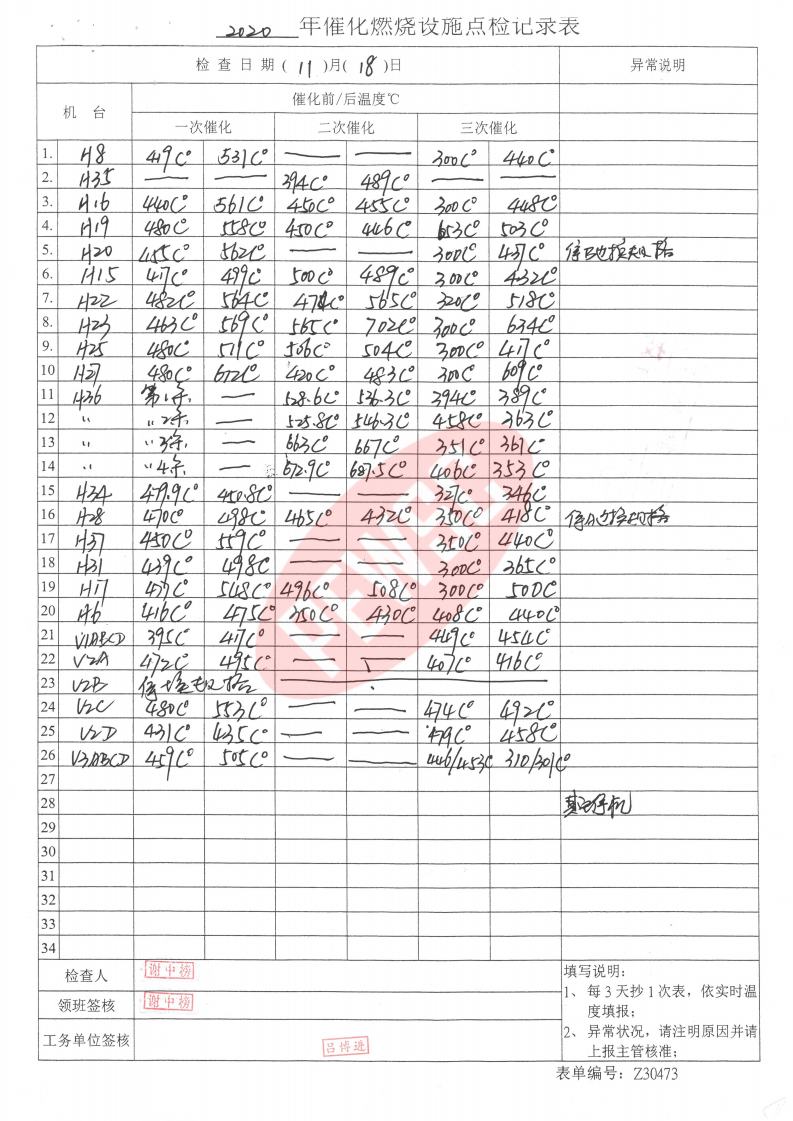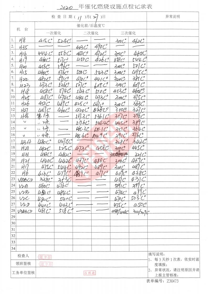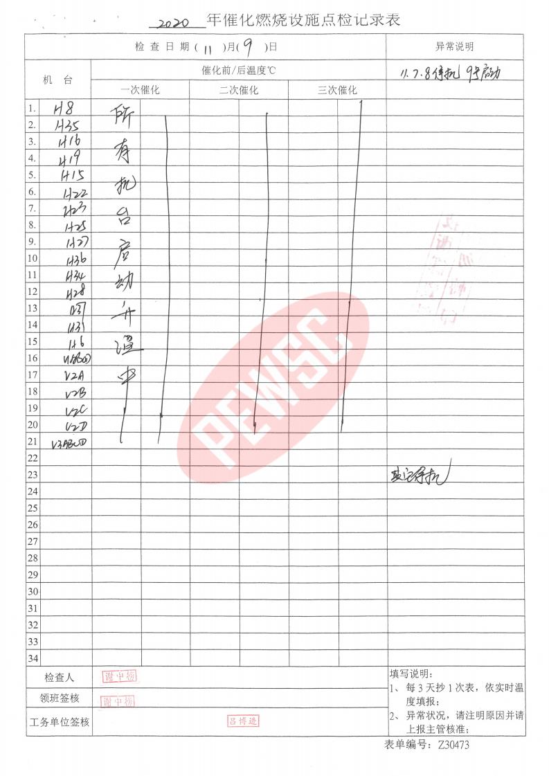 2020年11月份催化燃烧运行台账