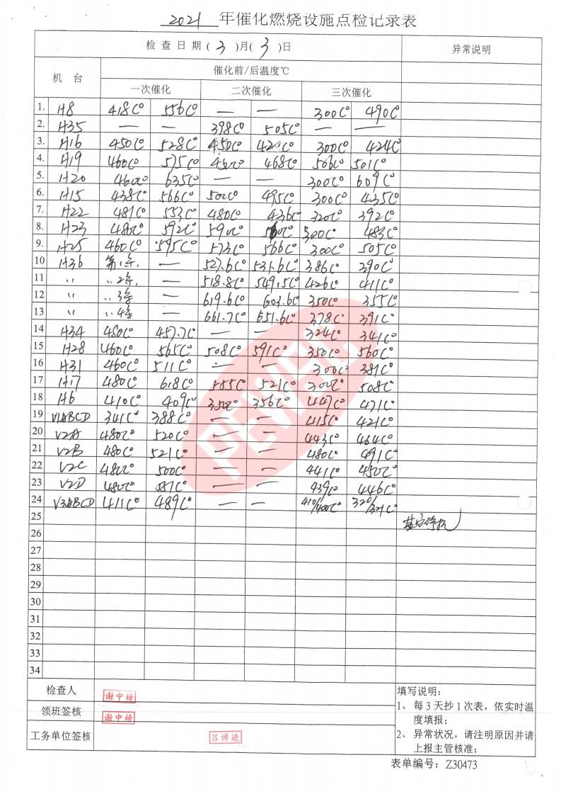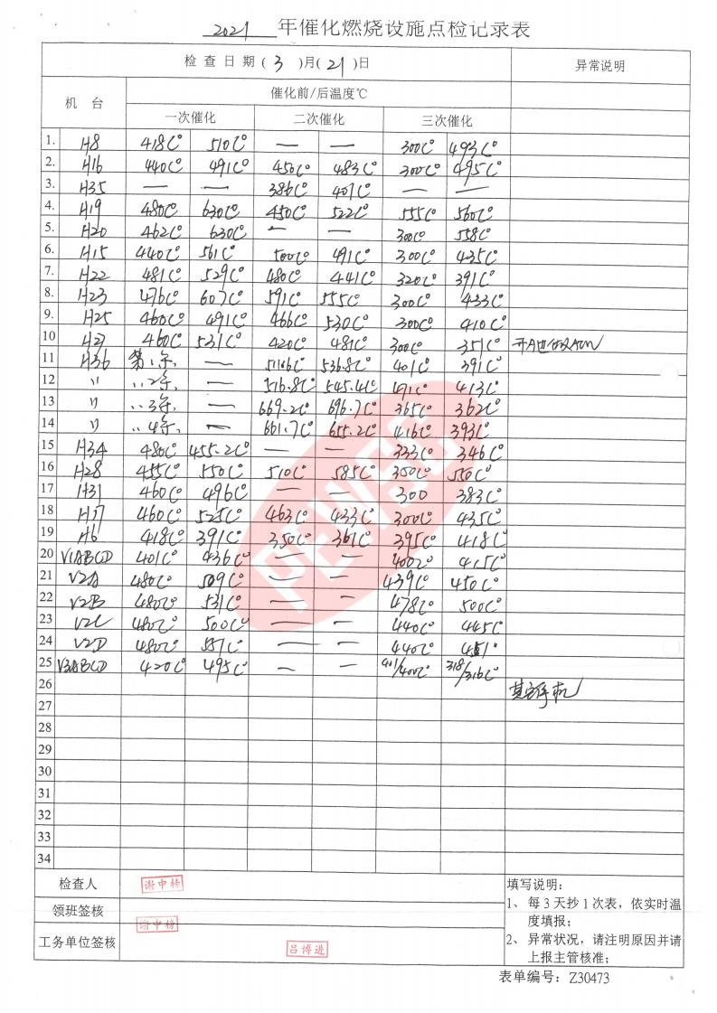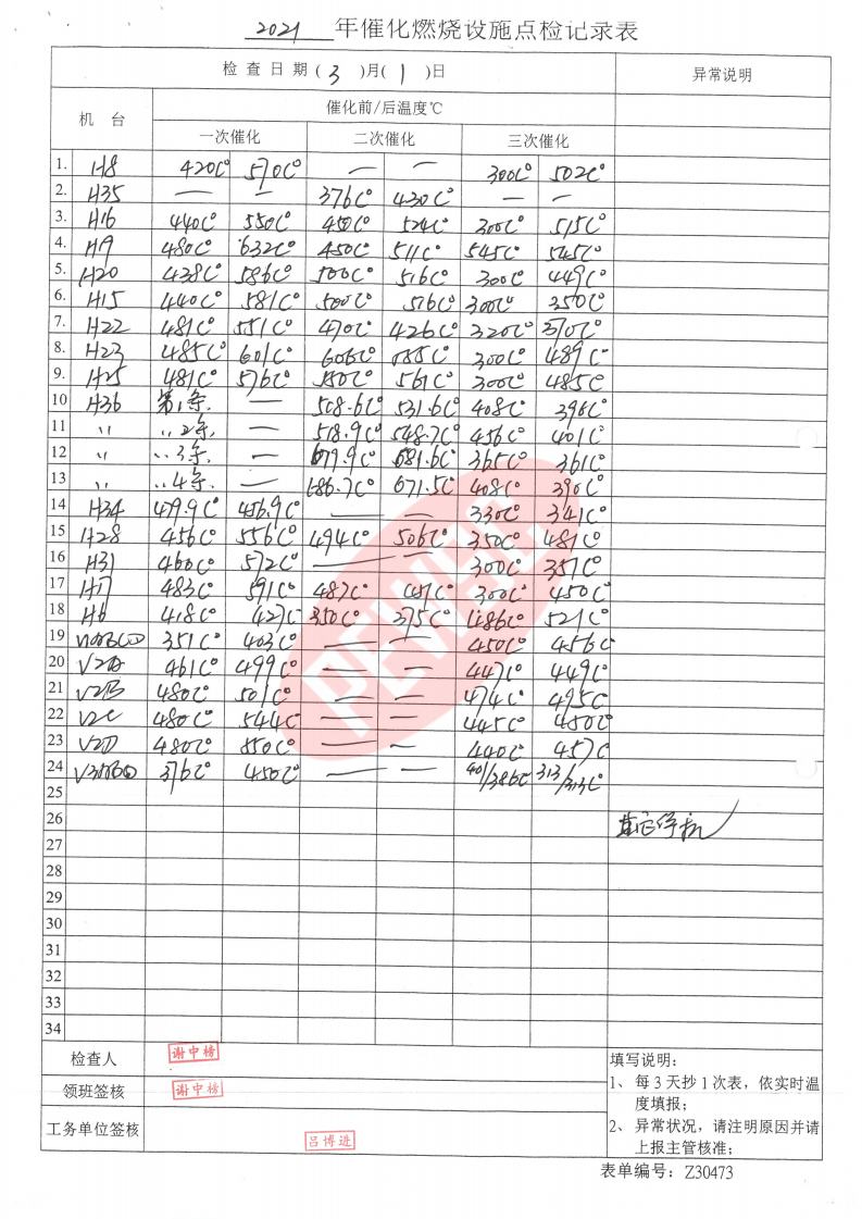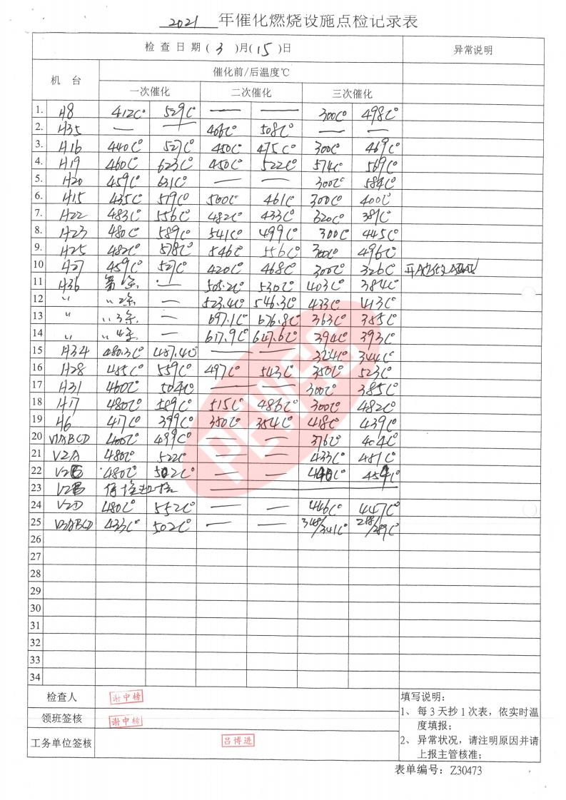 2021年3月份催化燃烧运行台账