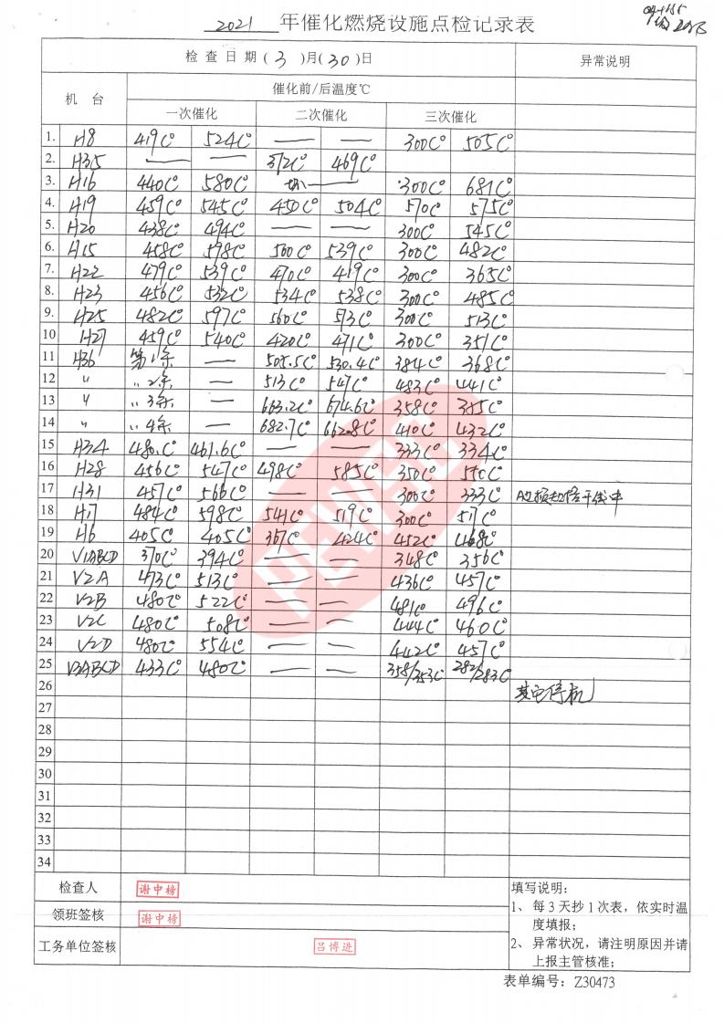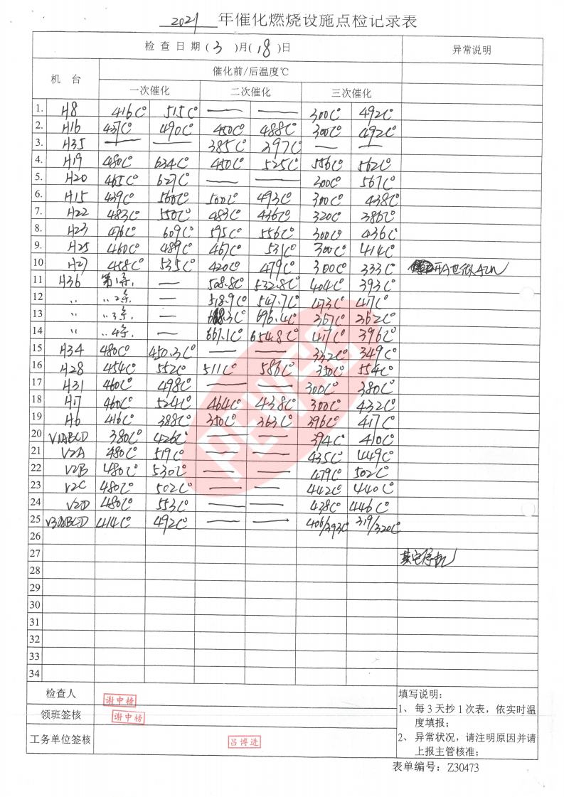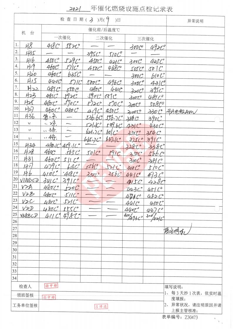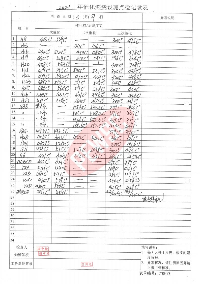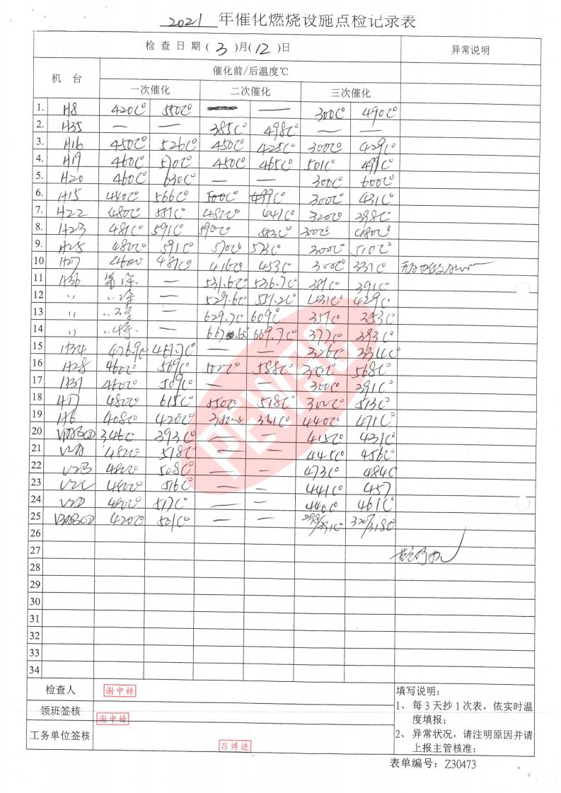 2021年3月份催化燃烧运行台账