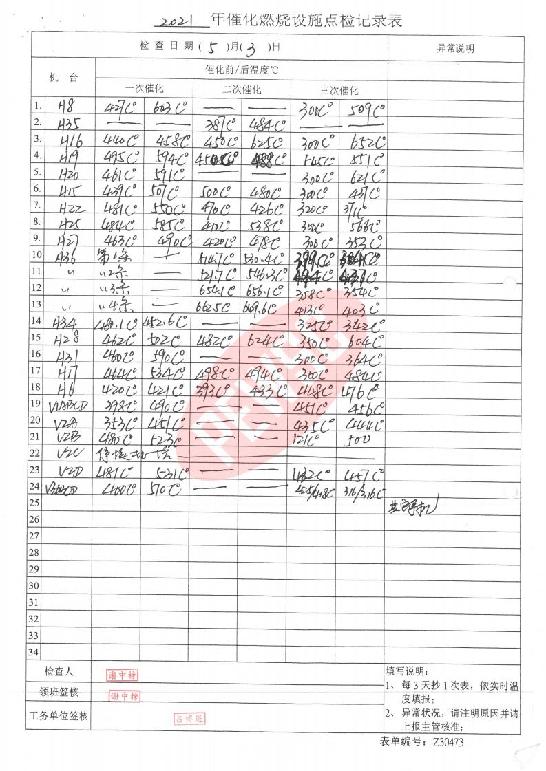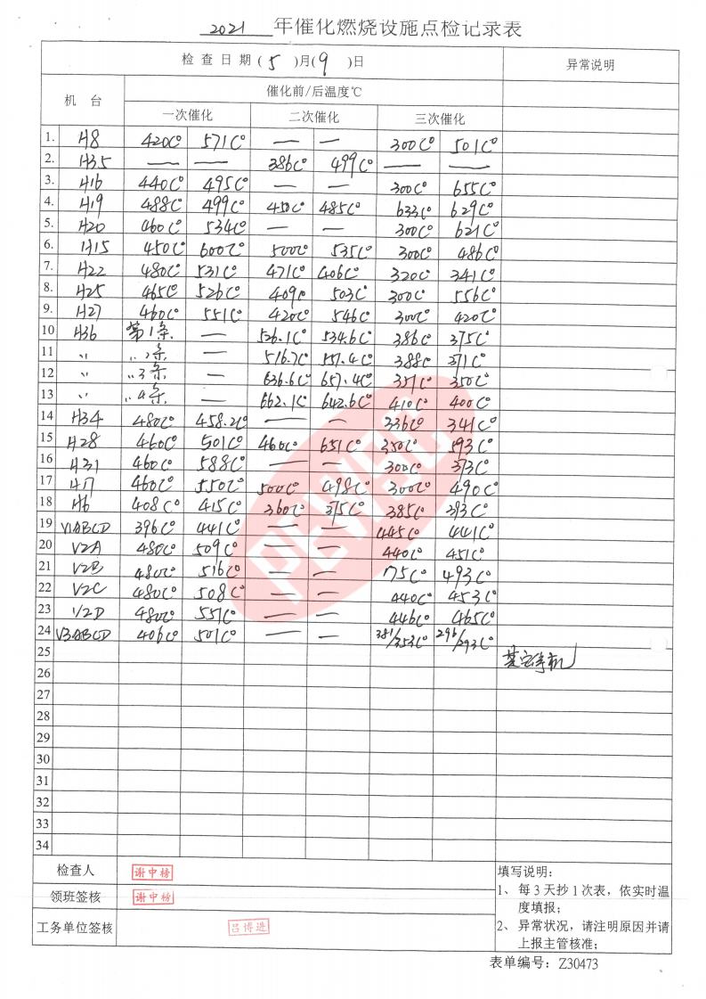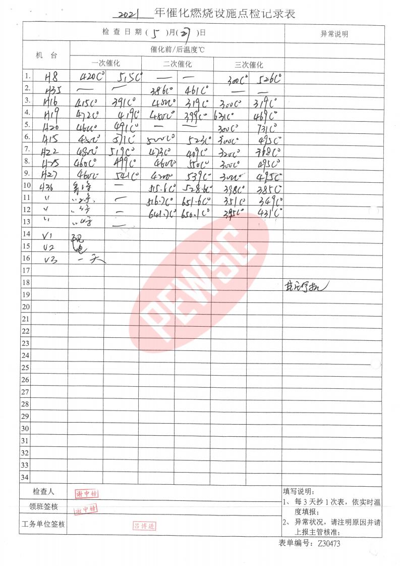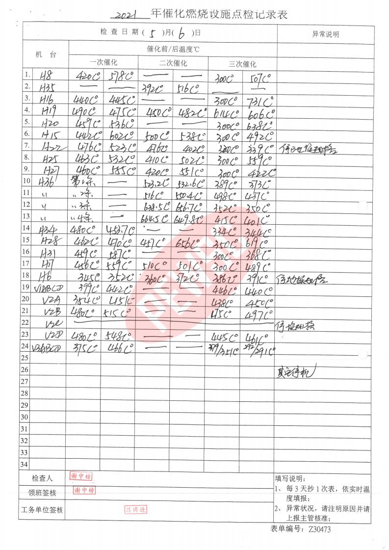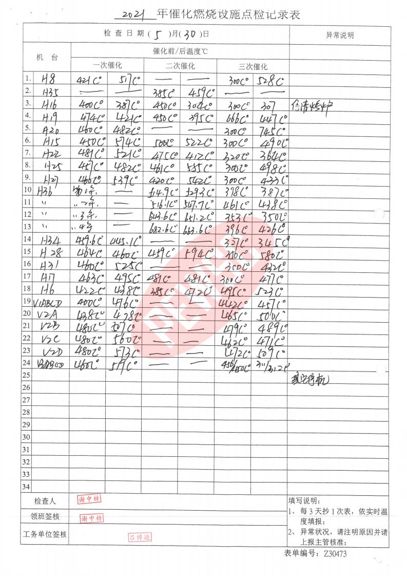 2021年5月份催化燃烧运行台账