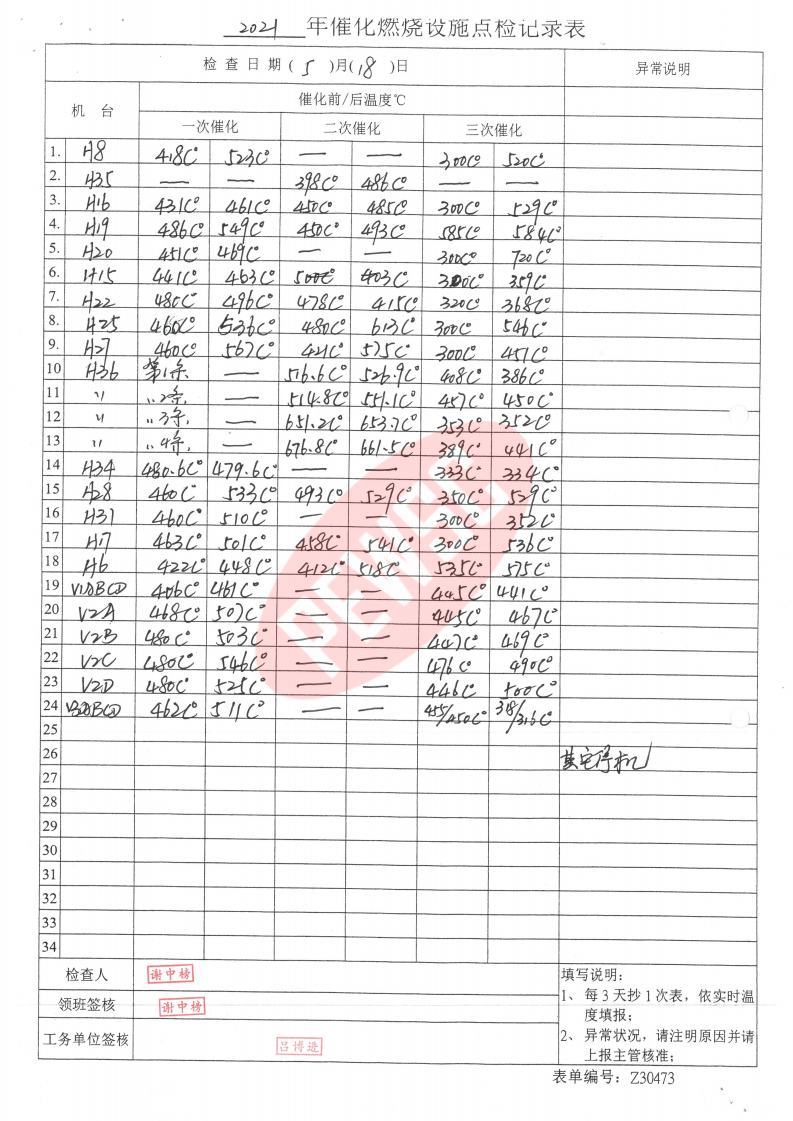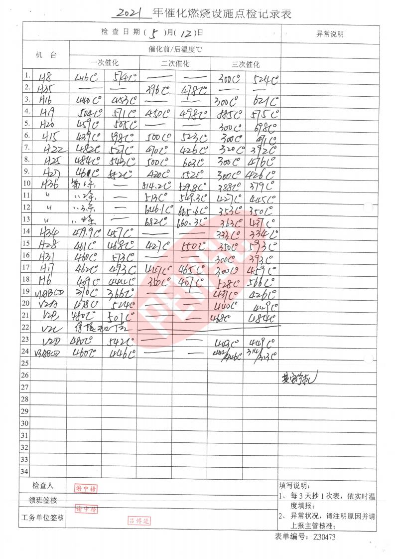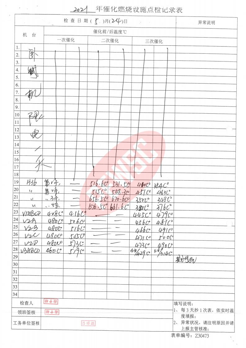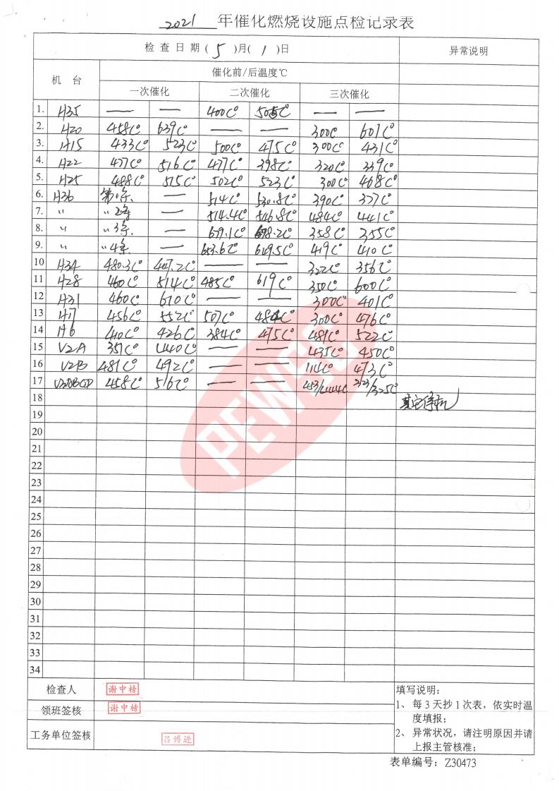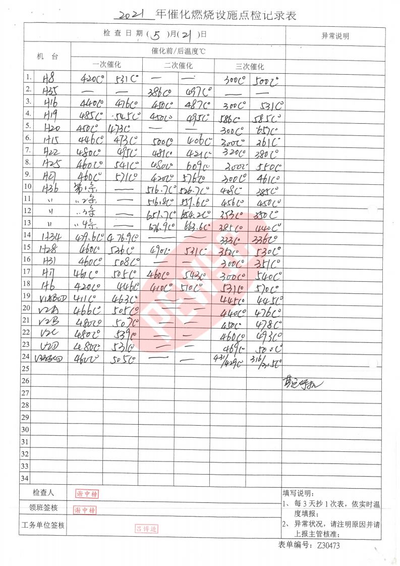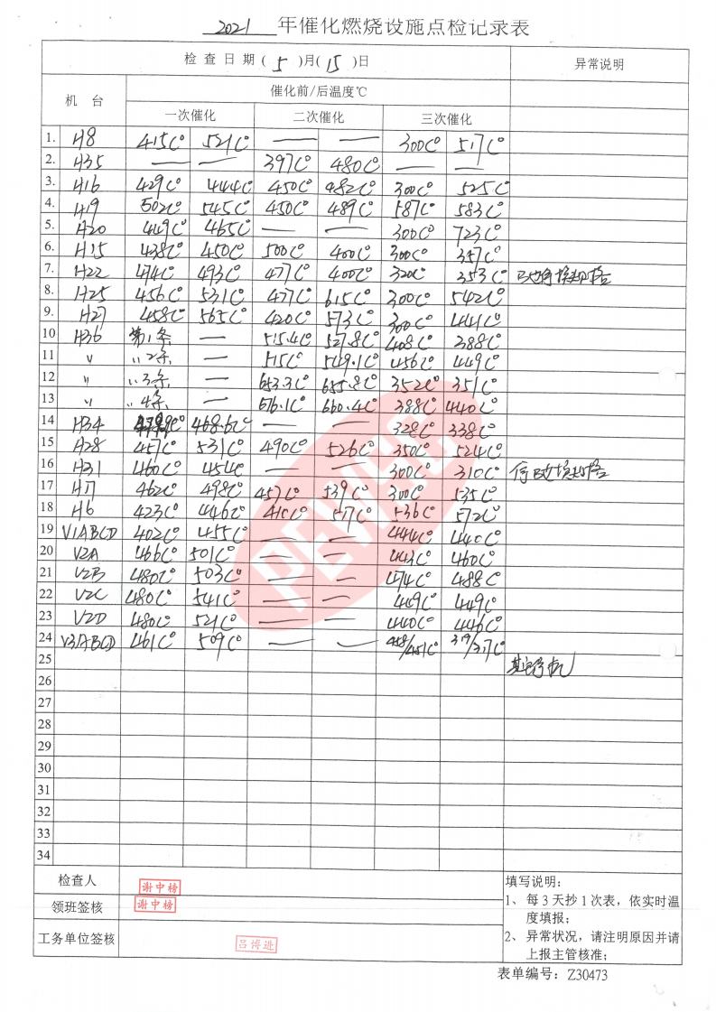 2021年5月份催化燃烧运行台账