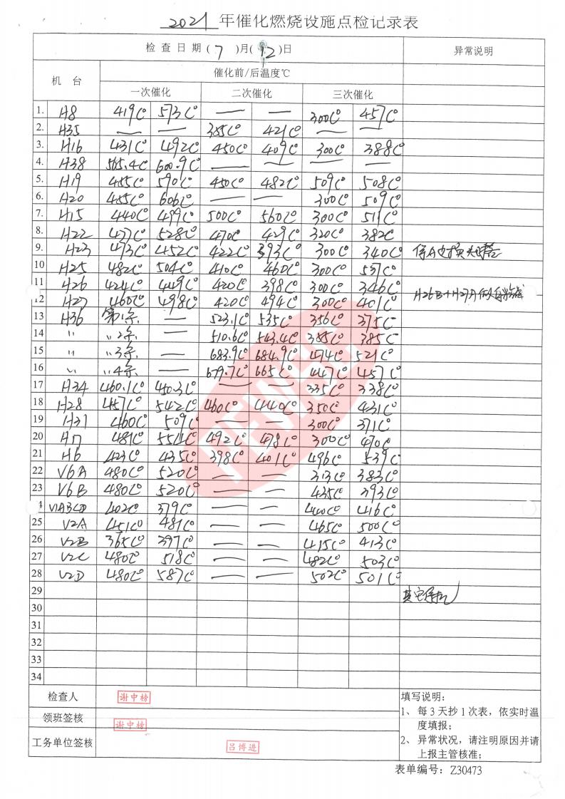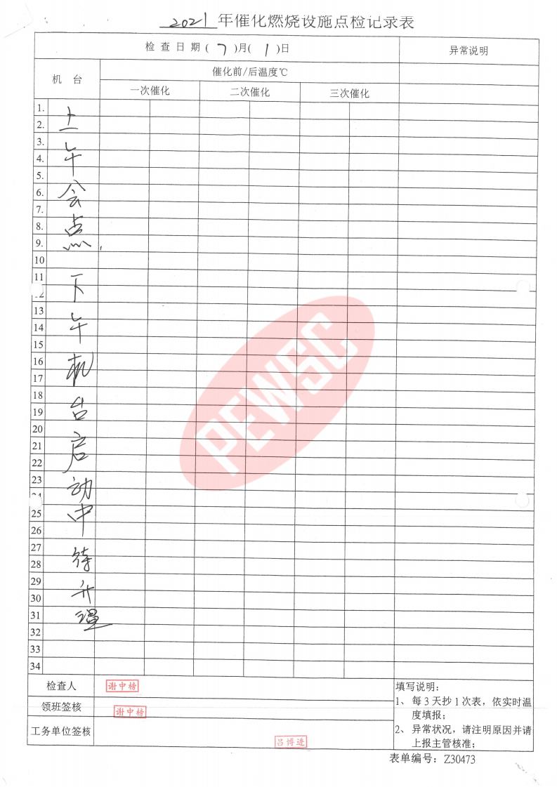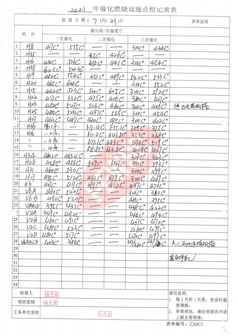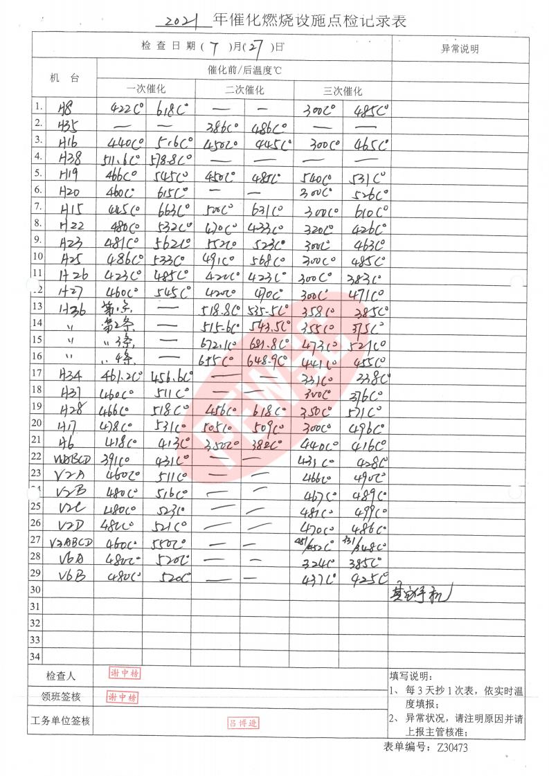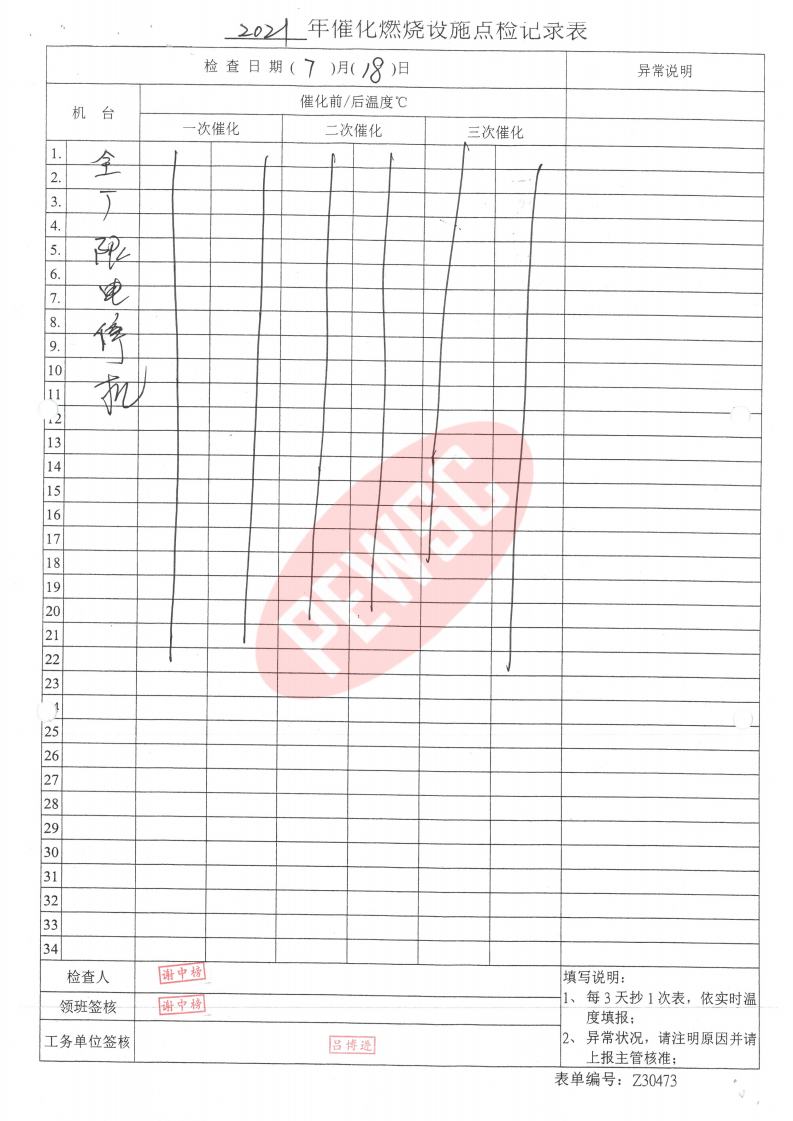 2021年7月份催化燃烧运行台账