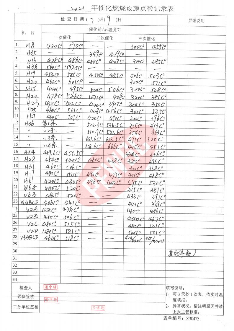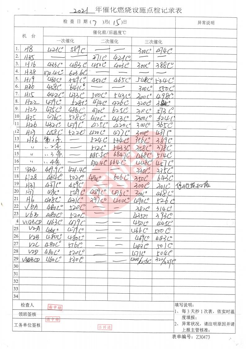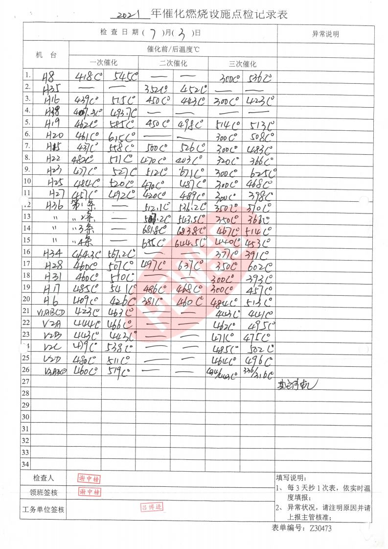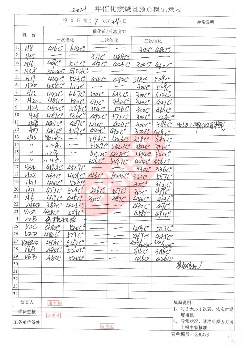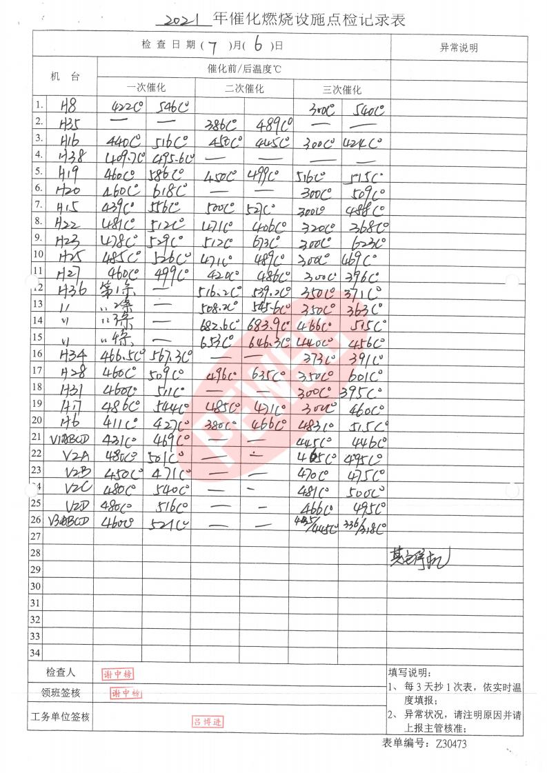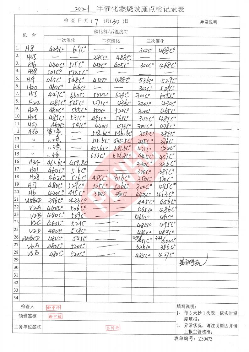 2021年7月份催化燃烧运行台账