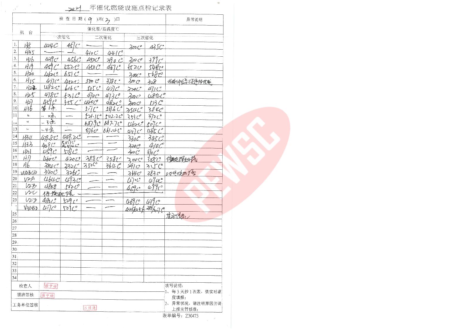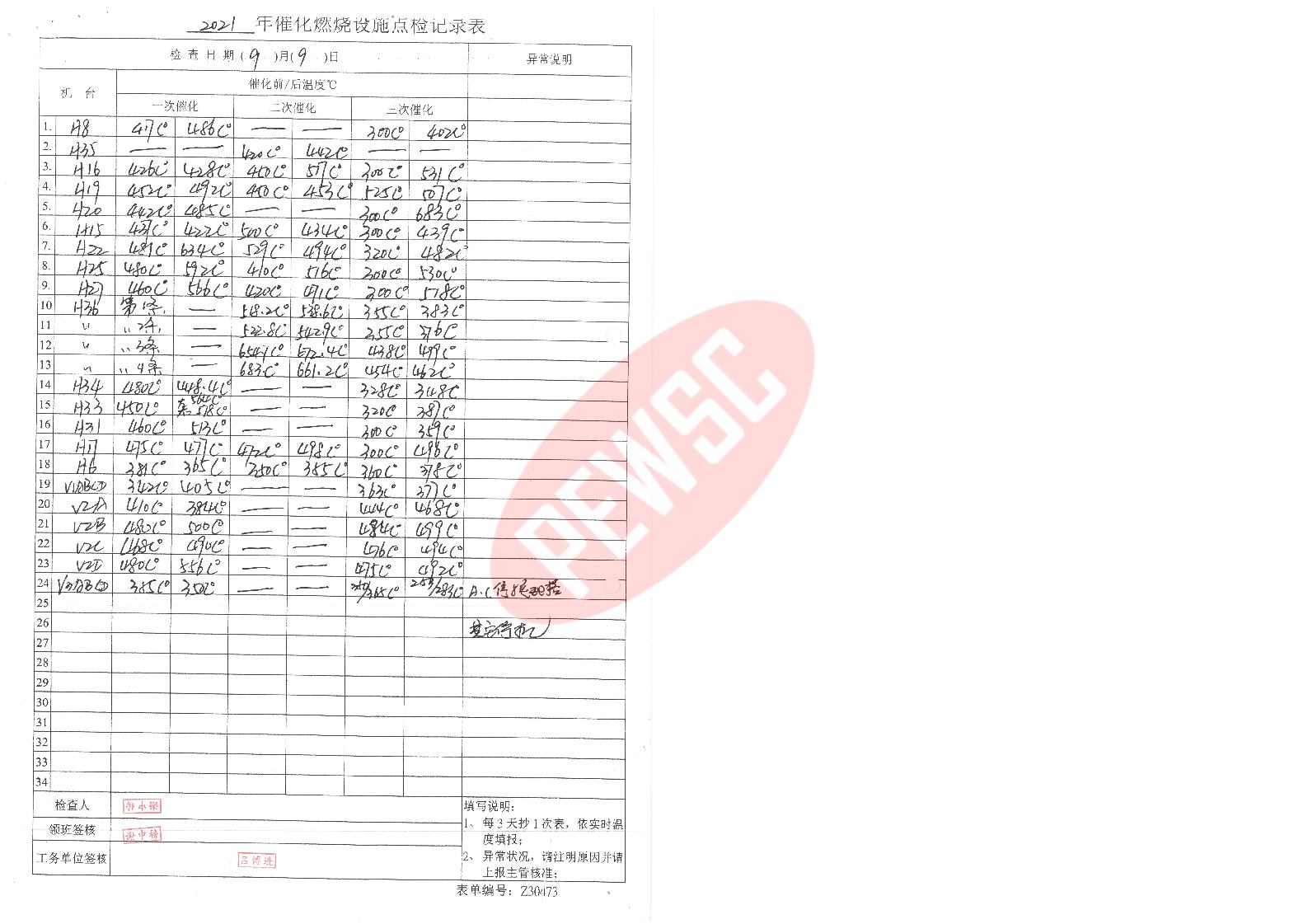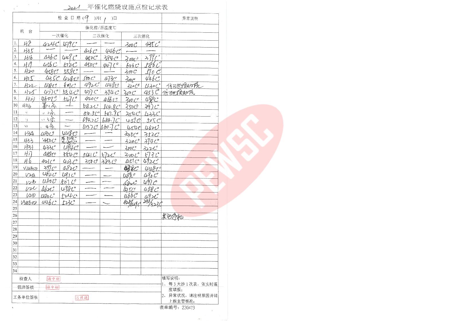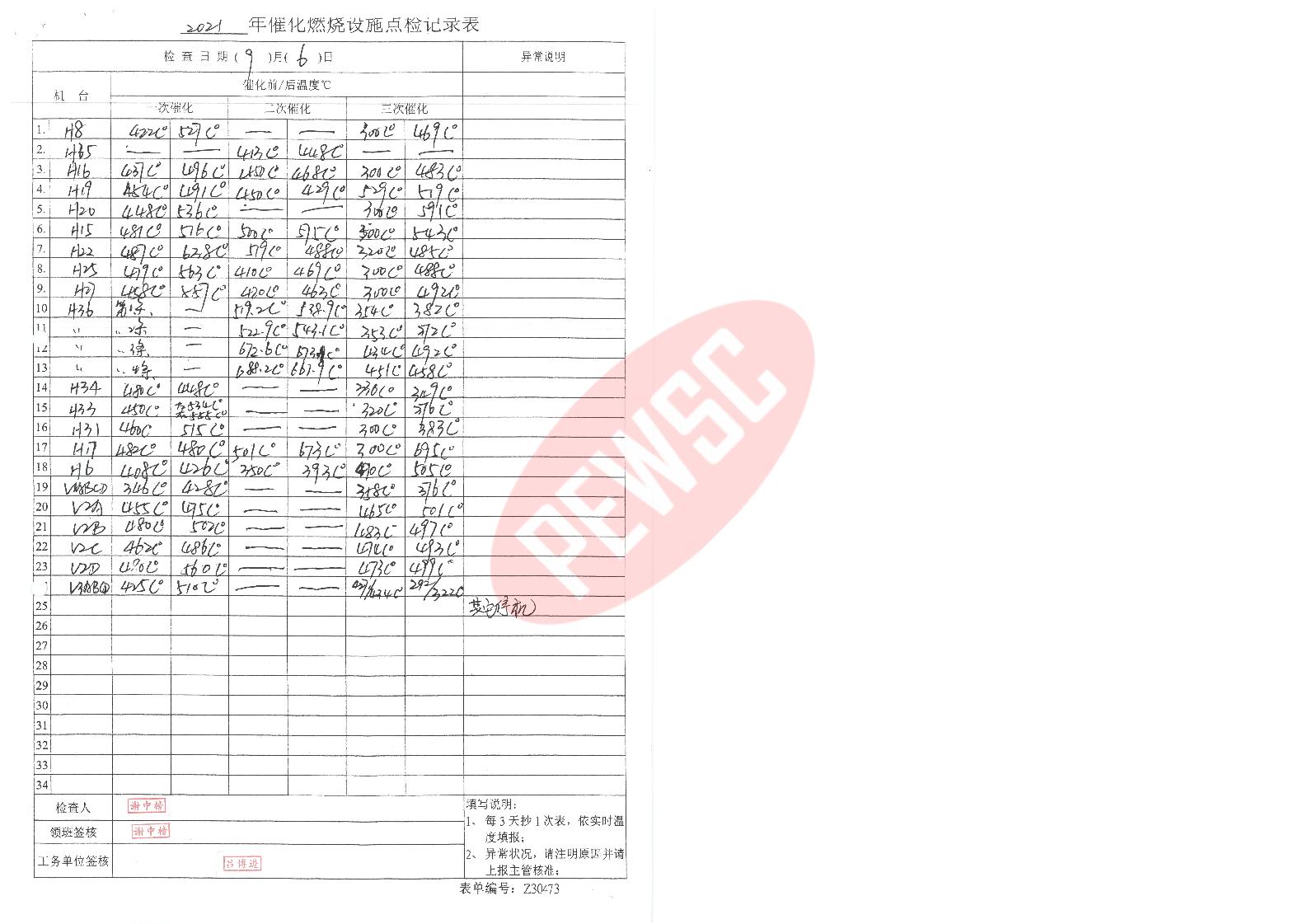 2021年9月份催化燃烧运行台账