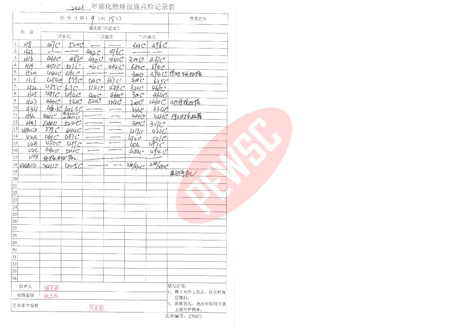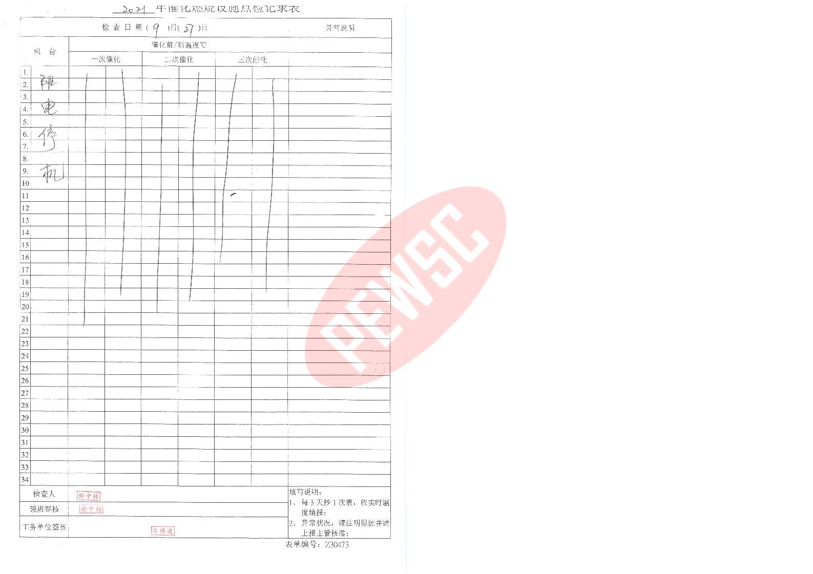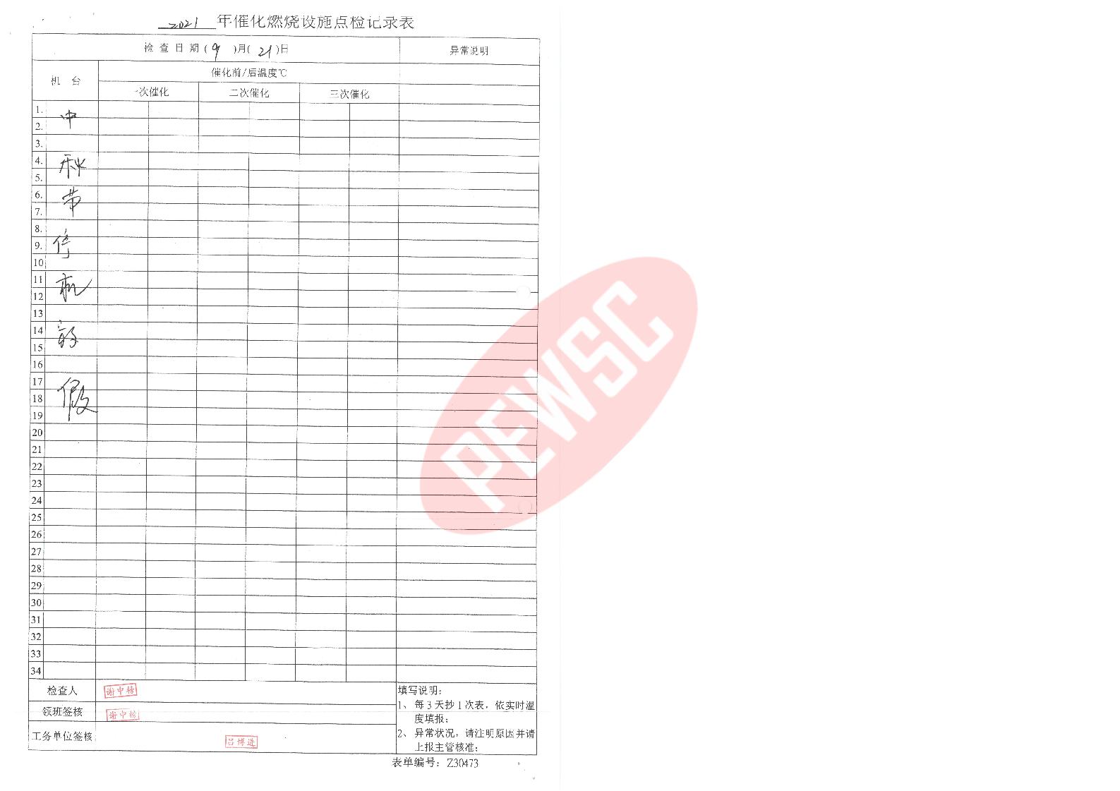 2021年9月份催化燃烧运行台账