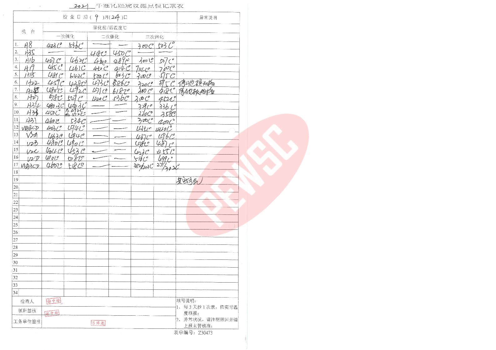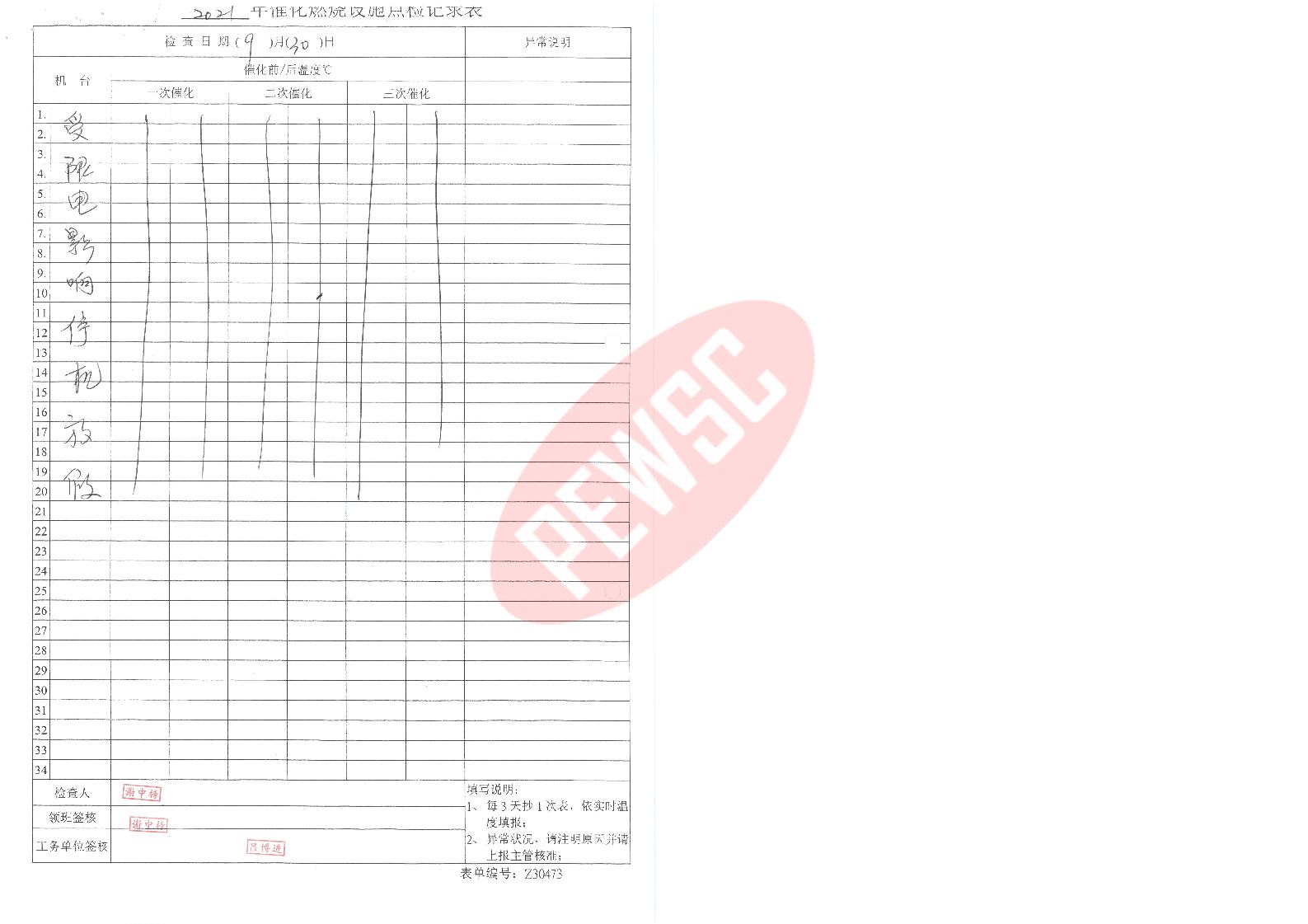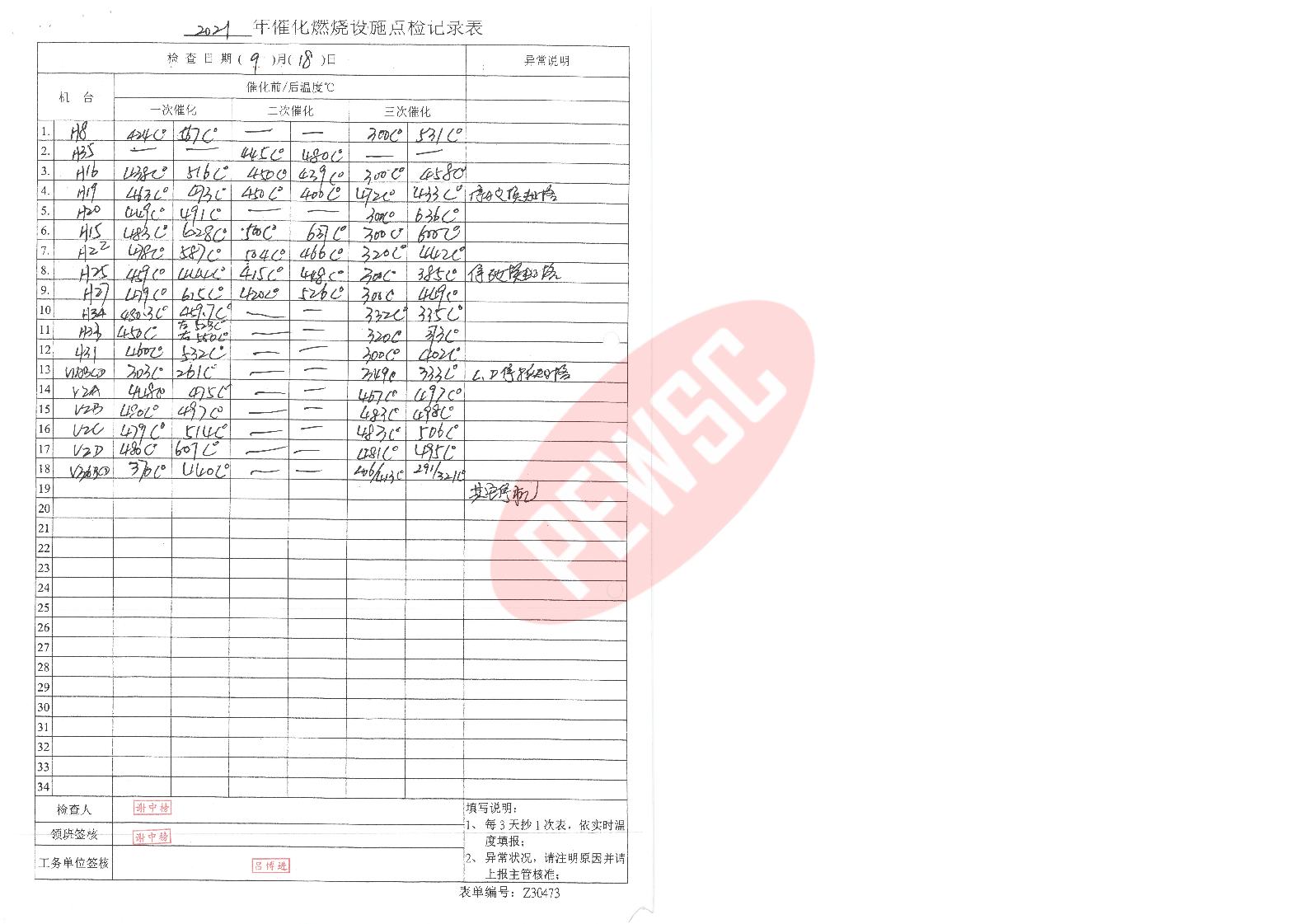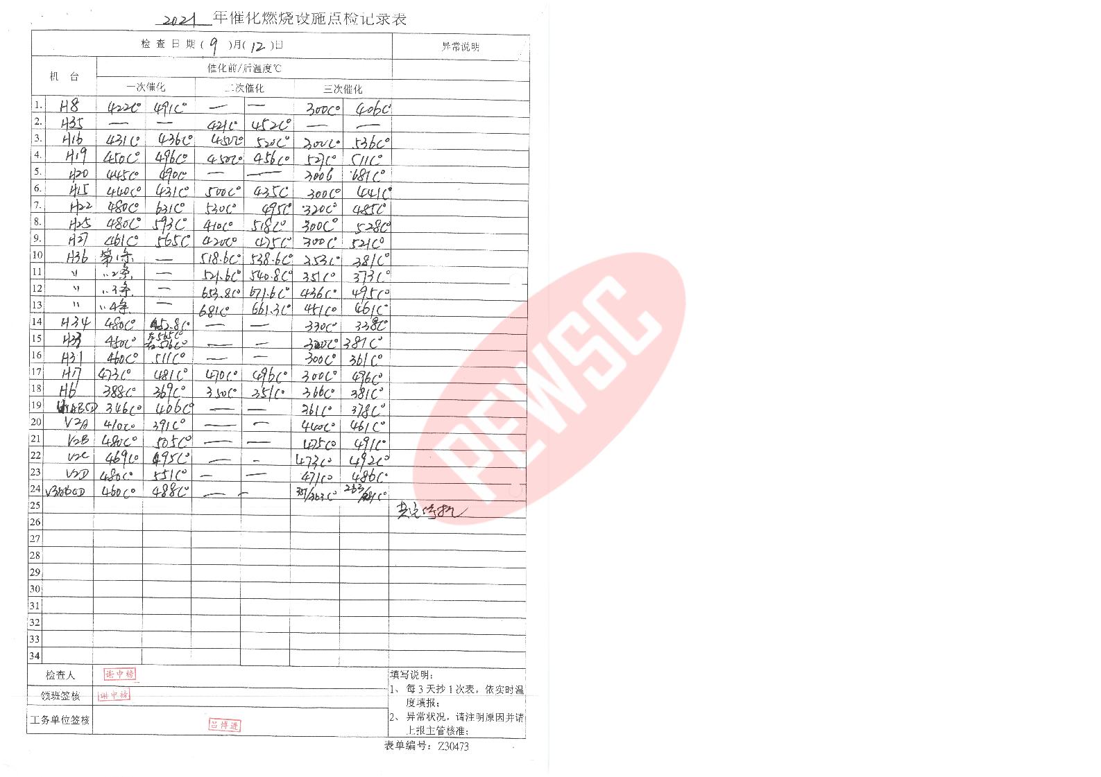 2021年9月份催化燃烧运行台账