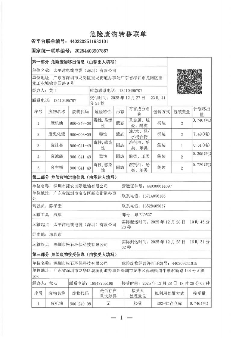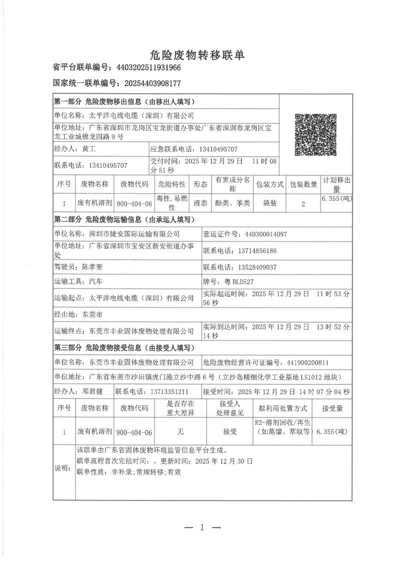 危险废物转移联单 2025-12