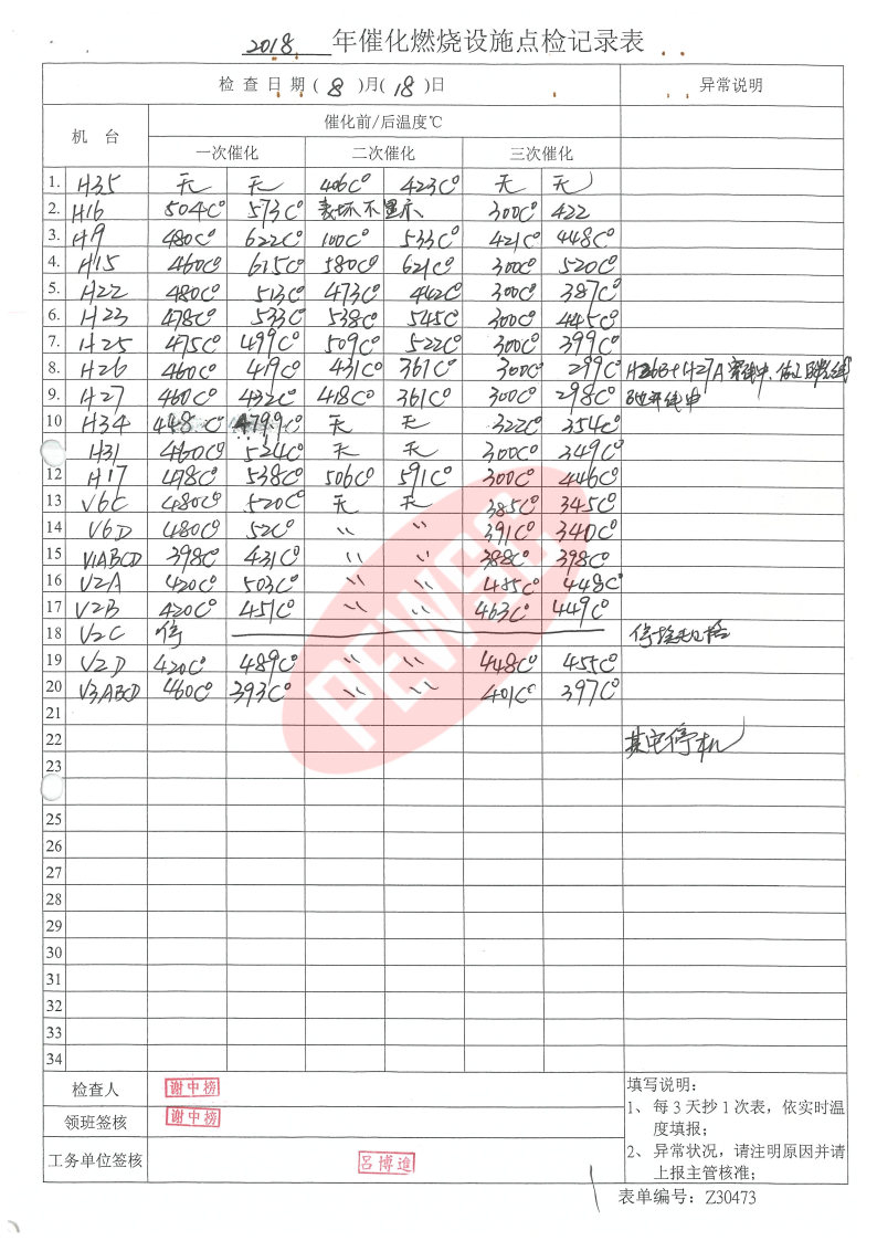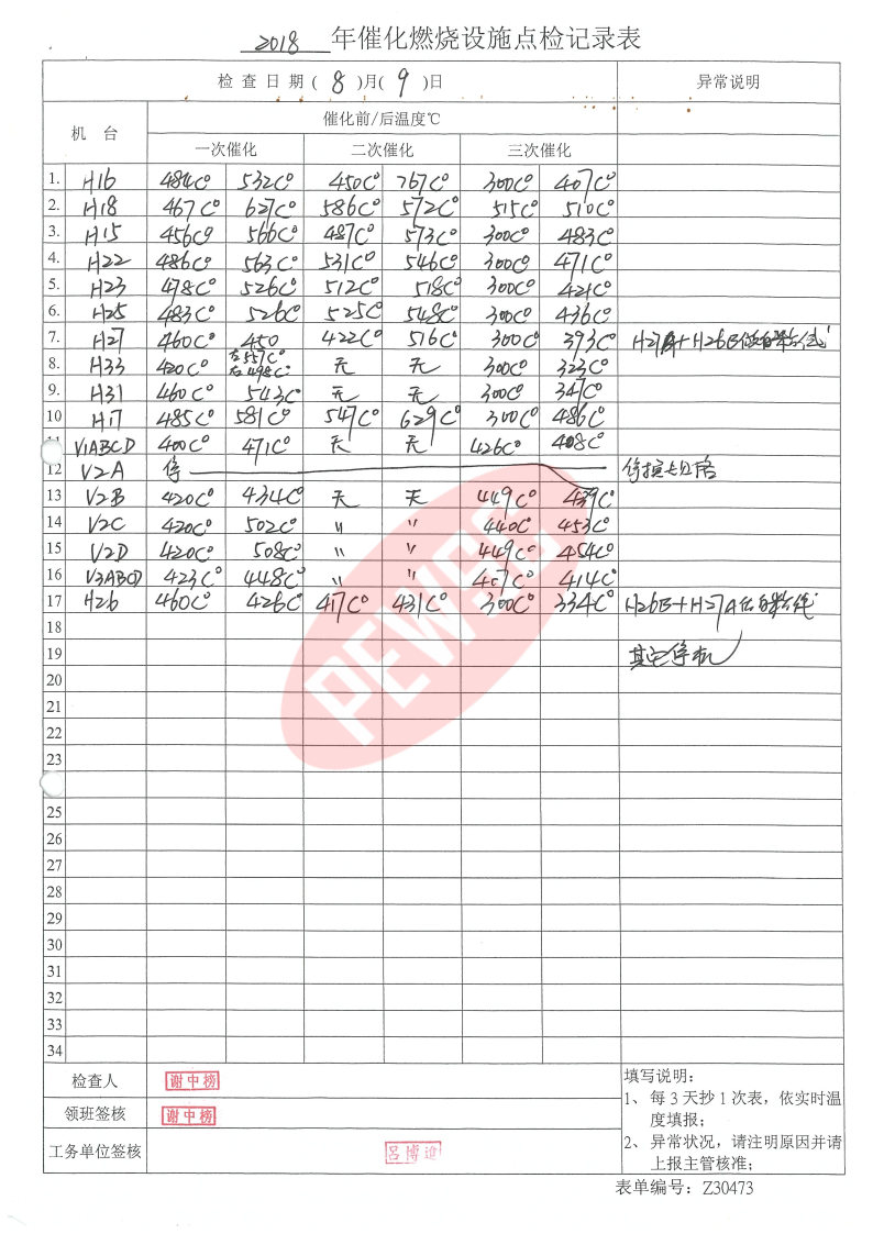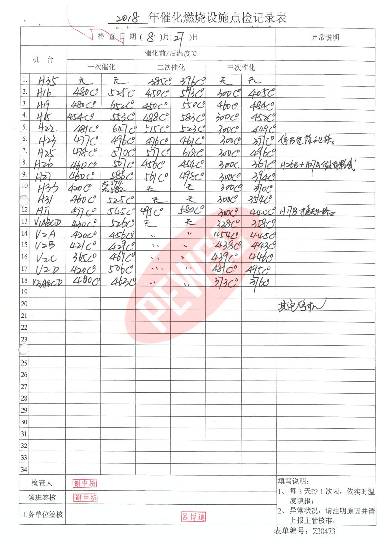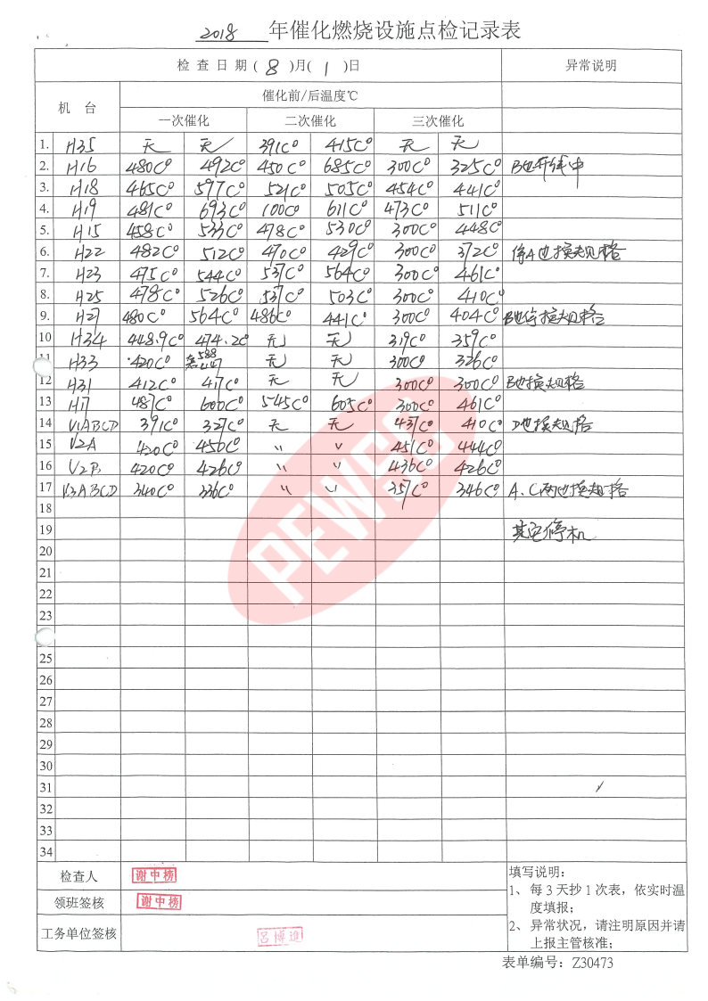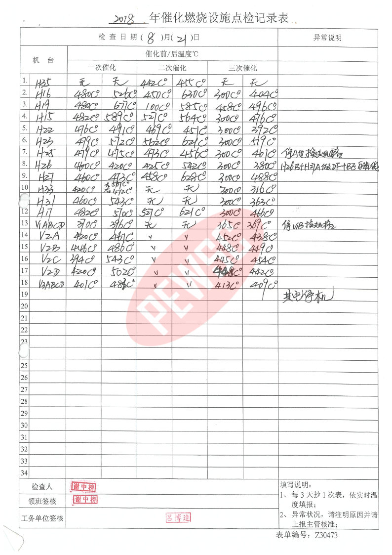 2018年8月份催化燃烧运行台账