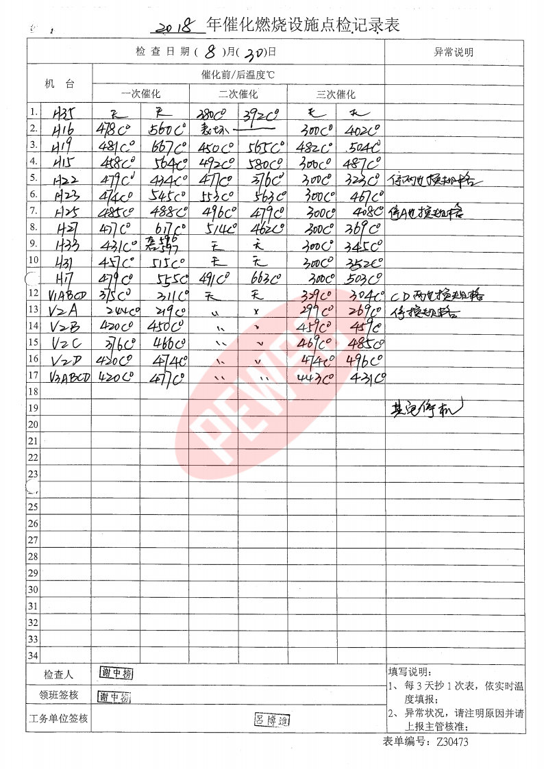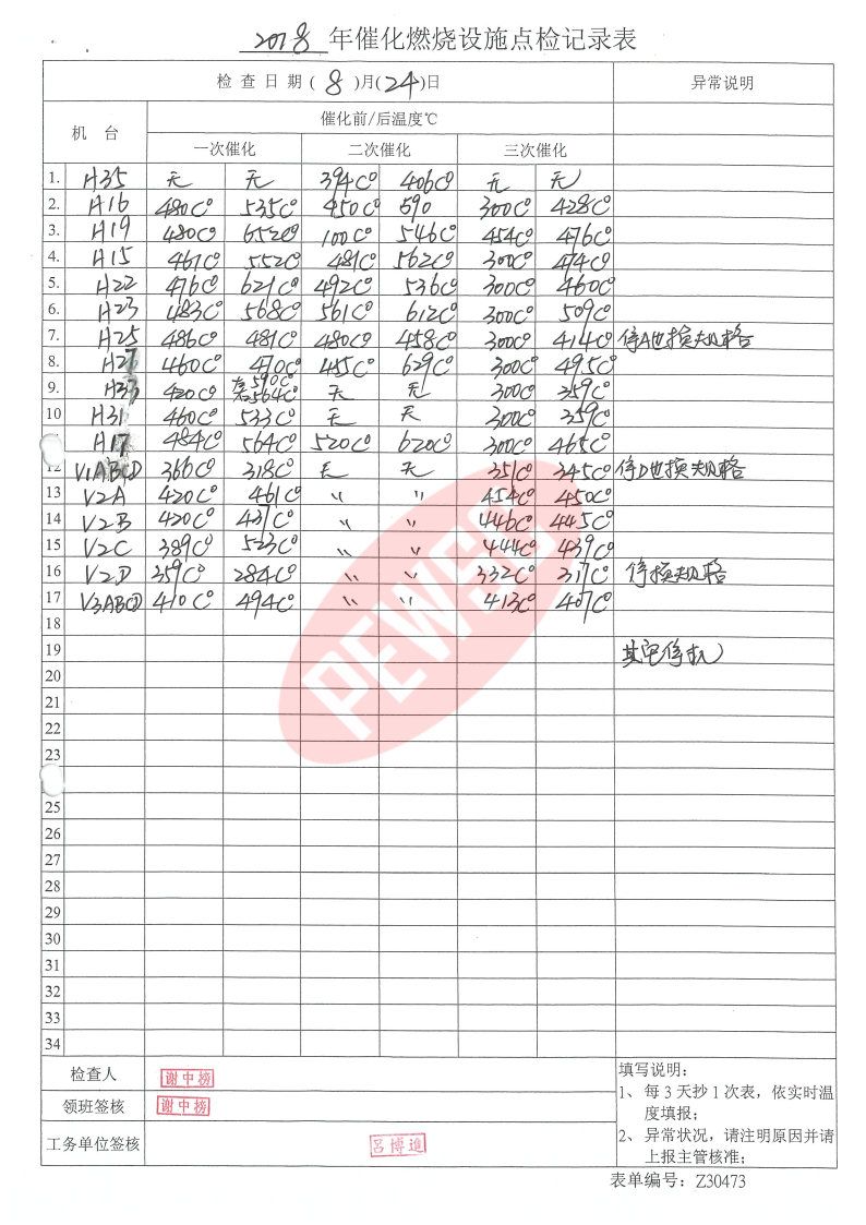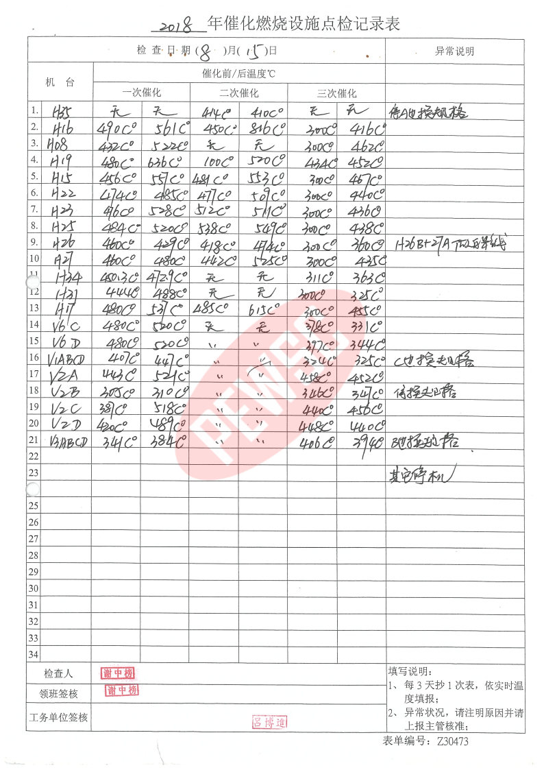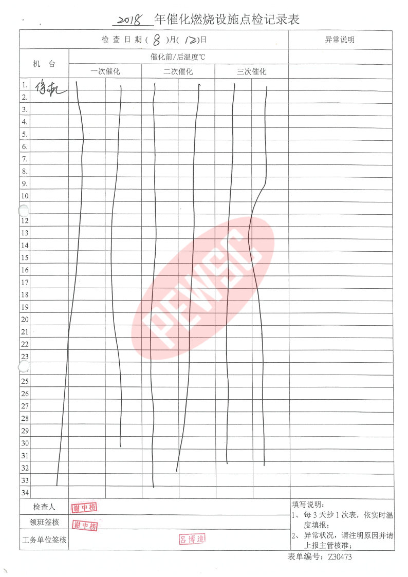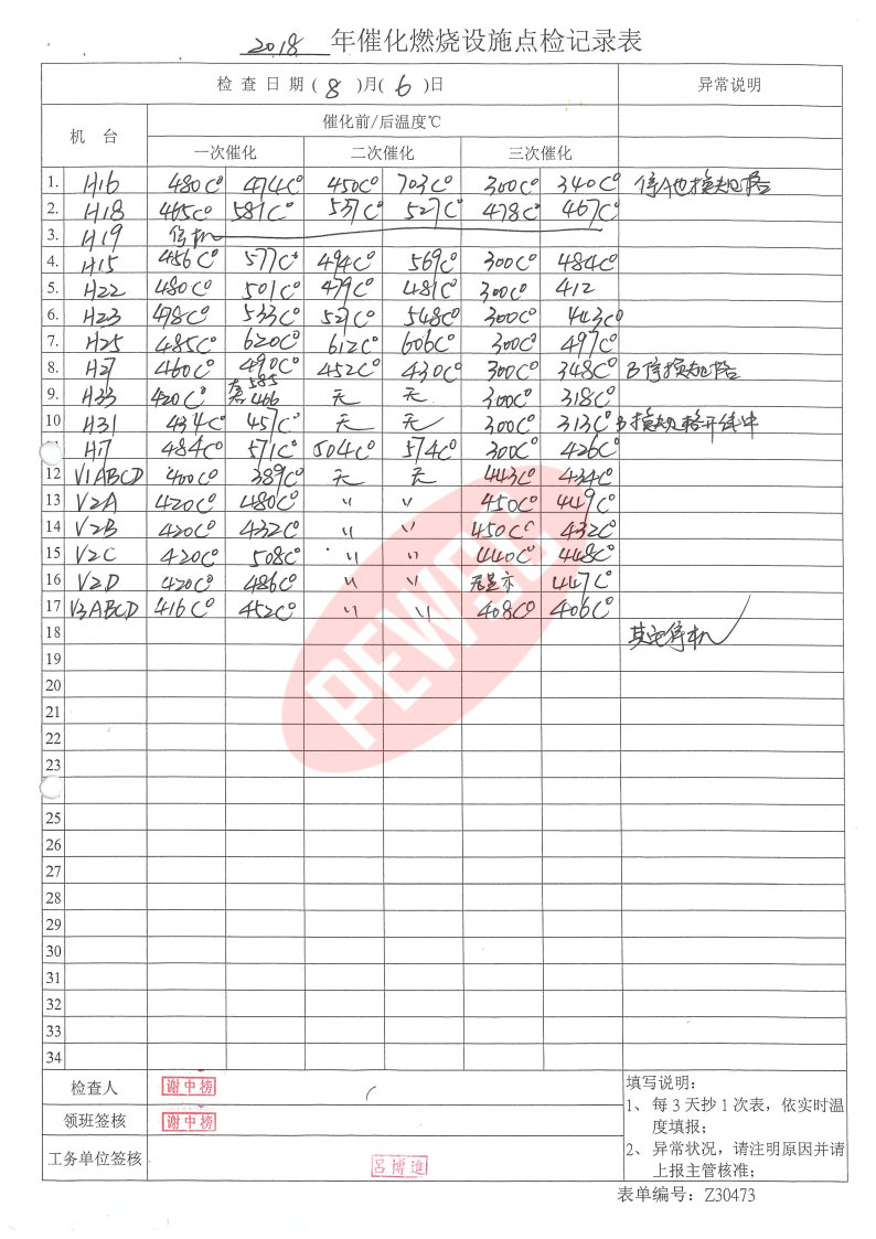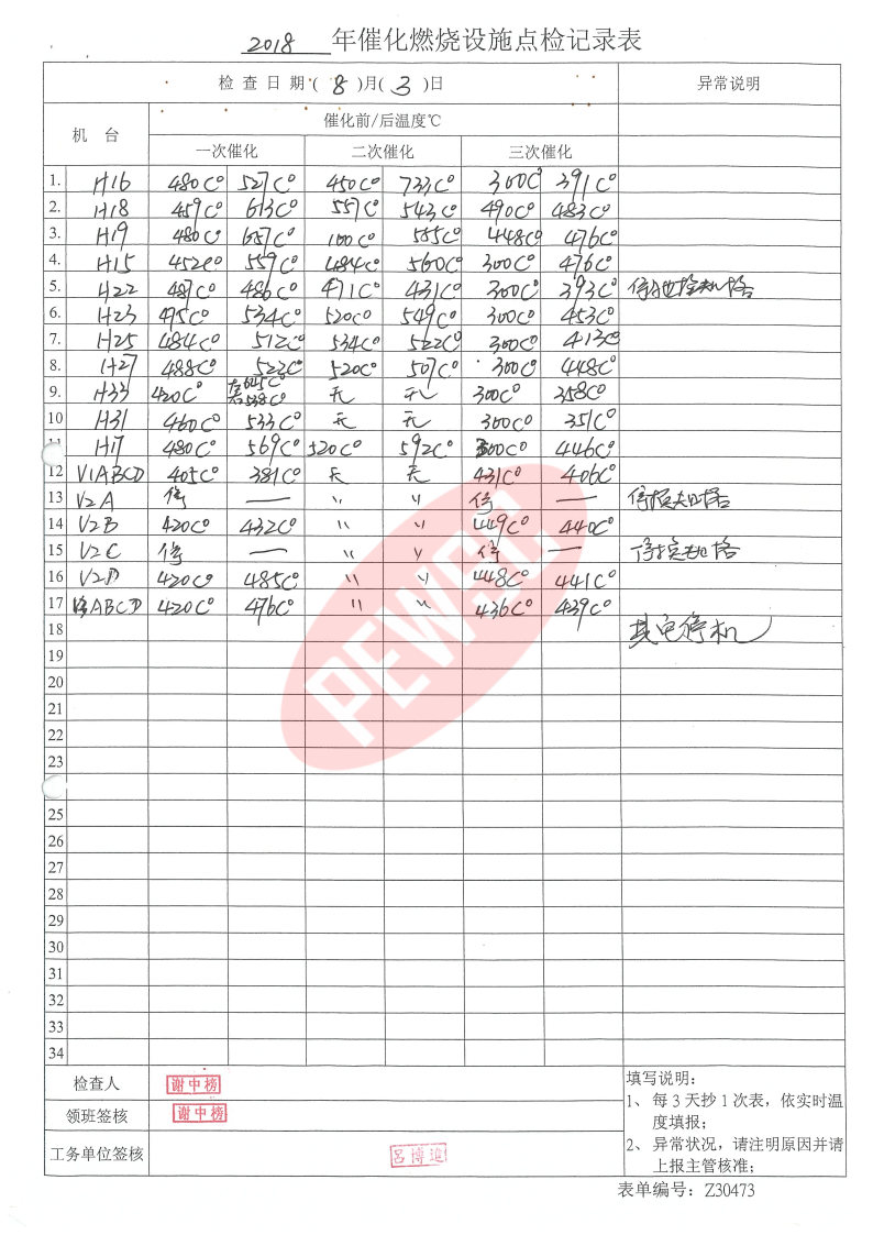 2018年8月份催化燃烧运行台账